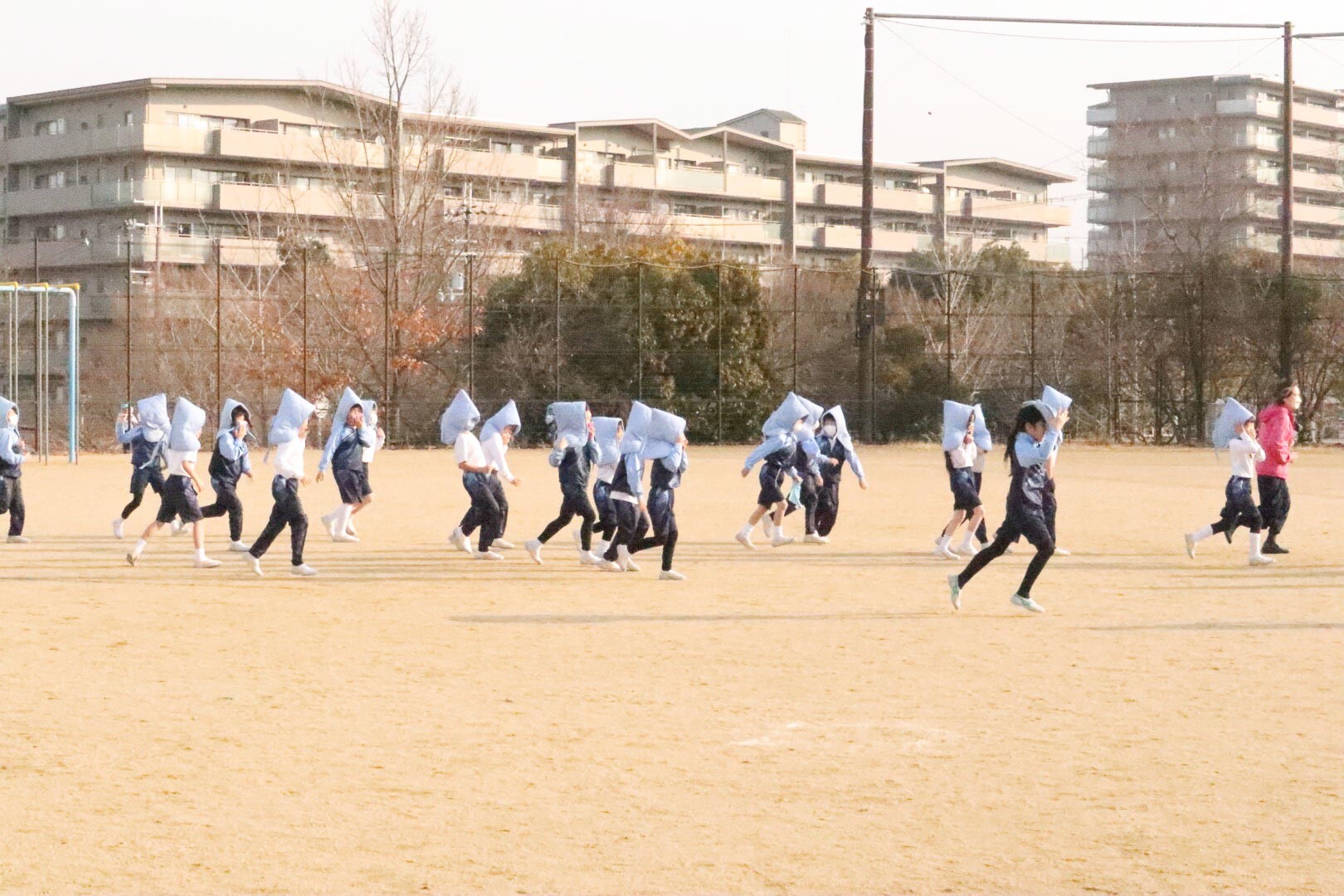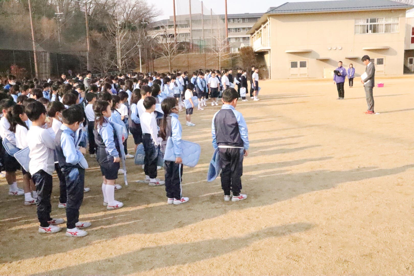 全員が避難場所に集合した後、高塚校長から「避難を始めてから3分15秒です。みんな敏速に避難ができました。大きな地震は、日本や世界中いつどこででも起こる可能性があります。大切なのは自分の命を守ることです」と、お話しがありました。