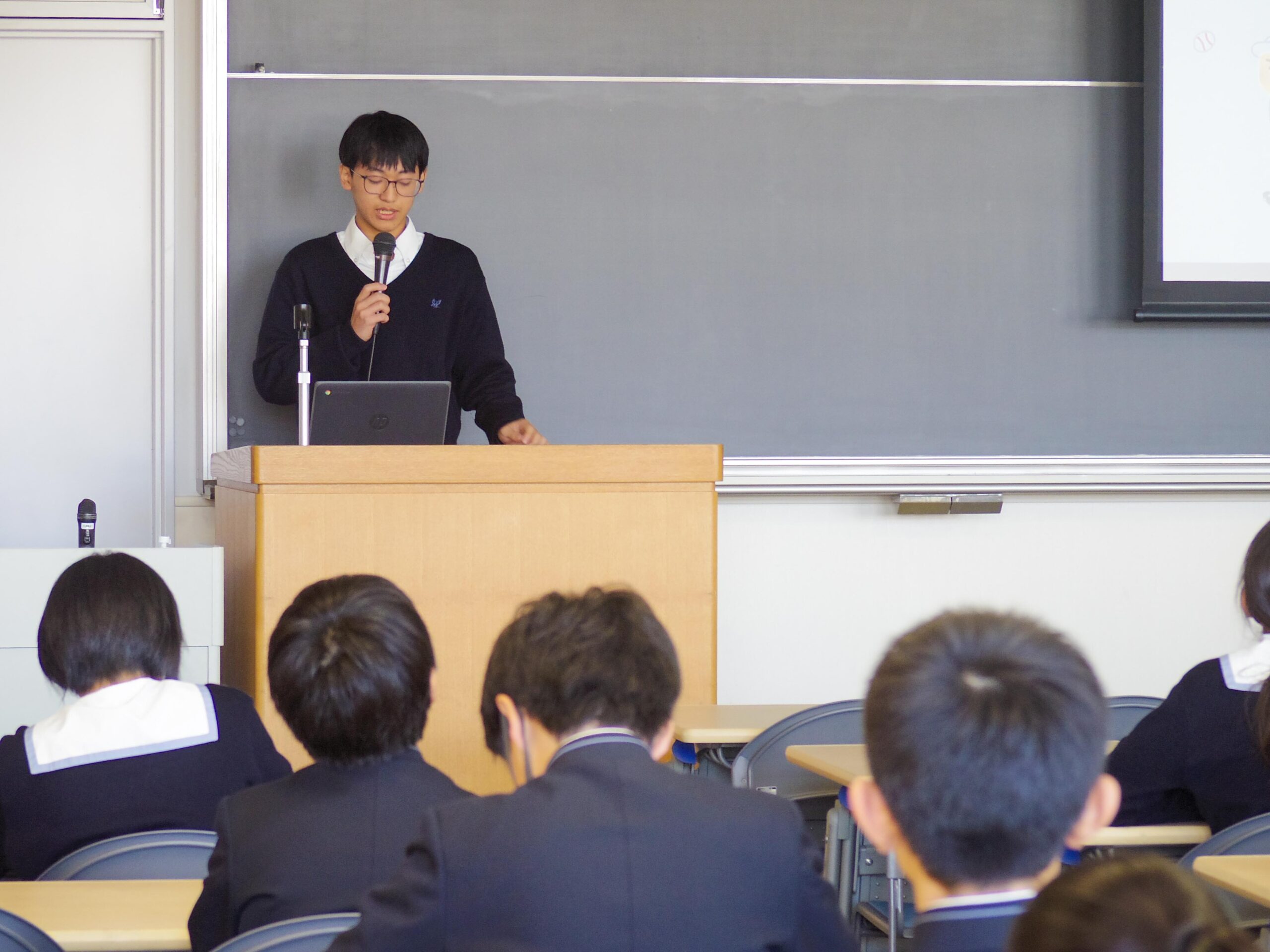 Yl生は代表生徒2名がスライドを使って、自身の経験をもとに学習面で変わることのほか、部活動や学校行事でのやりがいなどについて語りました。特に入試を控えているM2生に向けては、復習のポイントや教材についてもアドバイスをしました。