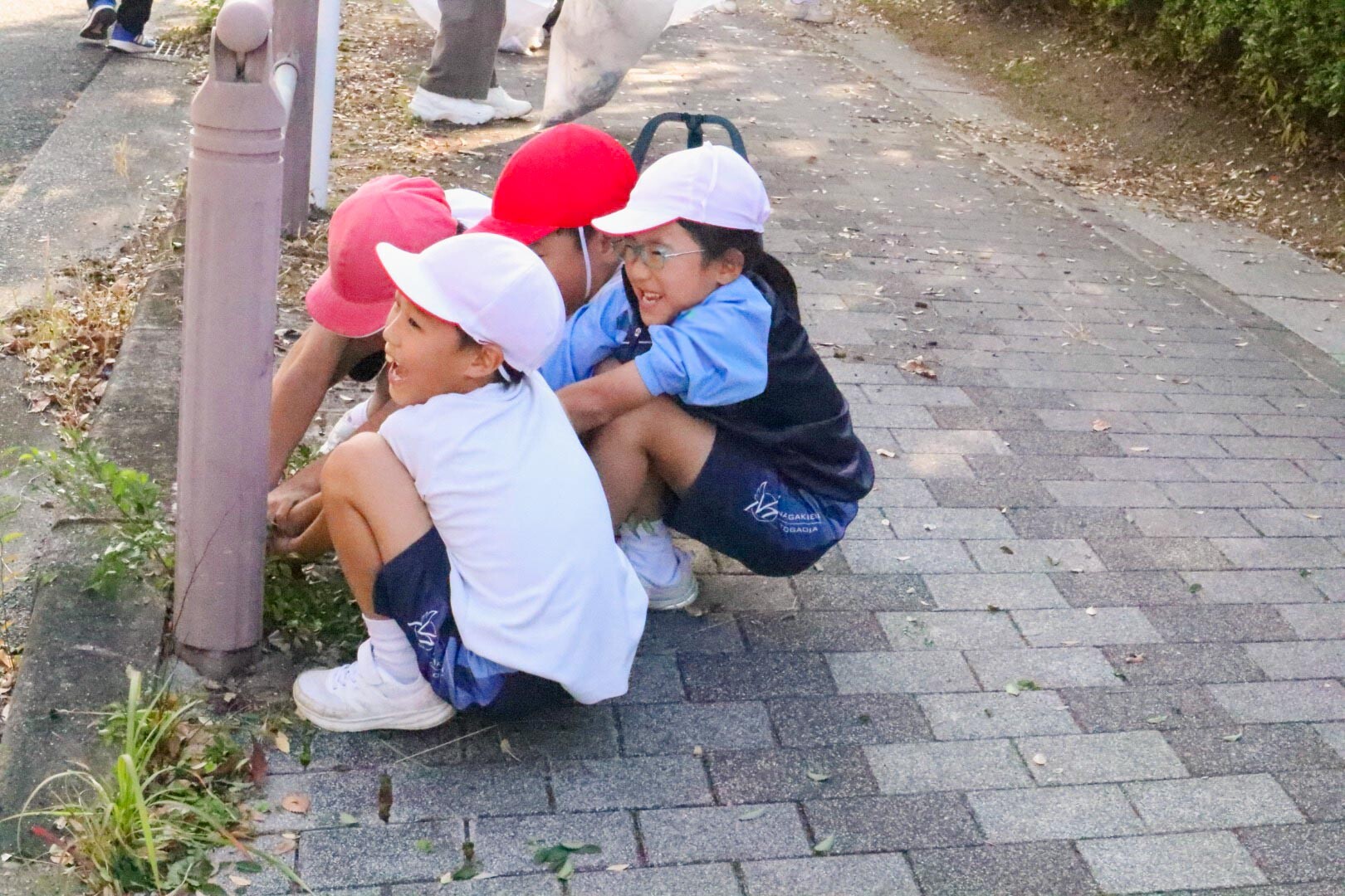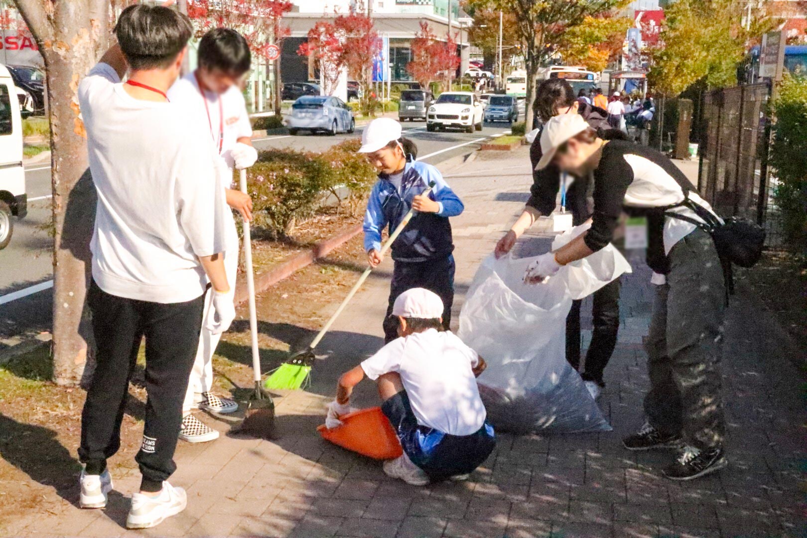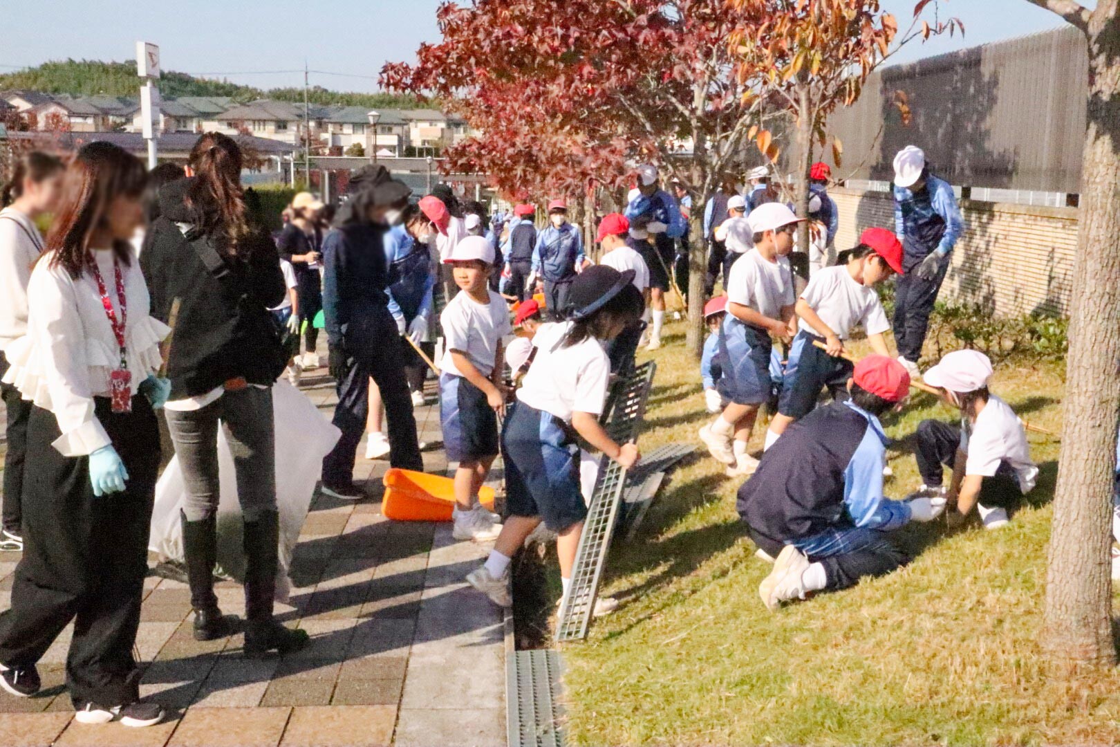 園児たちは、園庭やプロムナード、幼稚園に至る道などを先生と一緒に草抜き、落ち葉拾いをしました。小学生・中高生の児童、生徒たちと先生は、学校周辺や通学路、学園内の草抜き、落ち葉やゴミ拾いをしました。そして全体を保護者のみなさんや大学生有志がサポートしました。
