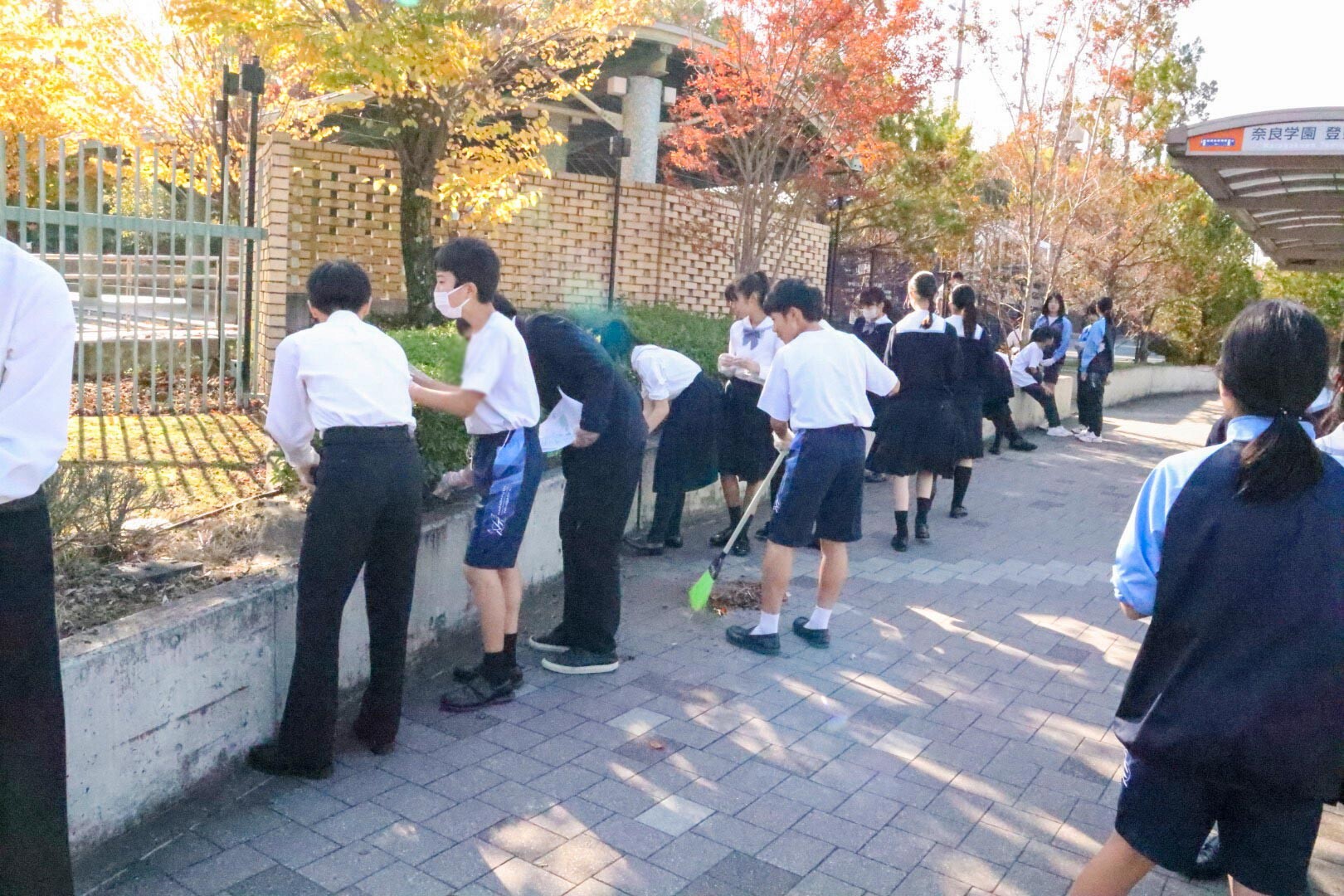 登美ヶ丘キャンパスで学ぶ幼稚園児から小学校の児童、中学・高校の生徒とその保護者、教職員さらに大学生有志が参加し「ふれあい清掃」を行いました。