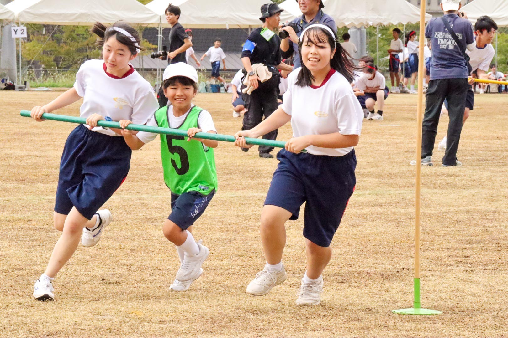 午前の部の最後には、年少児からY3生の代表がバトンをつなぐ「バトンをつなげ!とみっこオールスターリレー」を行い、学年が上がるにつれて、走る距離も増え、スピードもどんどん増していき、生徒たちの力強い走りに大きな声援がおくられました。