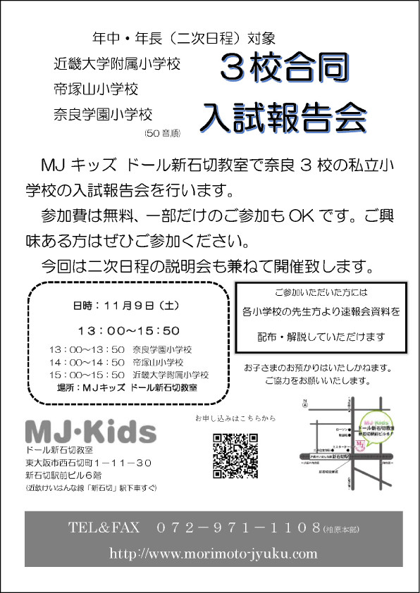 11/9(土)MJ・Kids主催3校合同入試速報会に本校が参加します 2024.10.09(水) Tweet 11月9日(土)MJ・Kids主催3校合同入試速報会に本校が参加します。 申込方法等の詳細につきましては、こちら(http://www.morimoto-jyuku.com/)からご覧ください。 « 10/26(土)B日程入試説明会のご案内 10/29(火)・11/14(木)授業見学ツアー&ミニ説明会のご案内 »