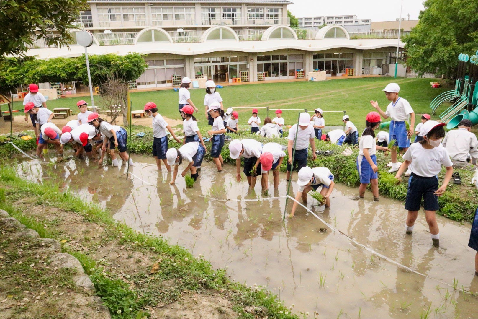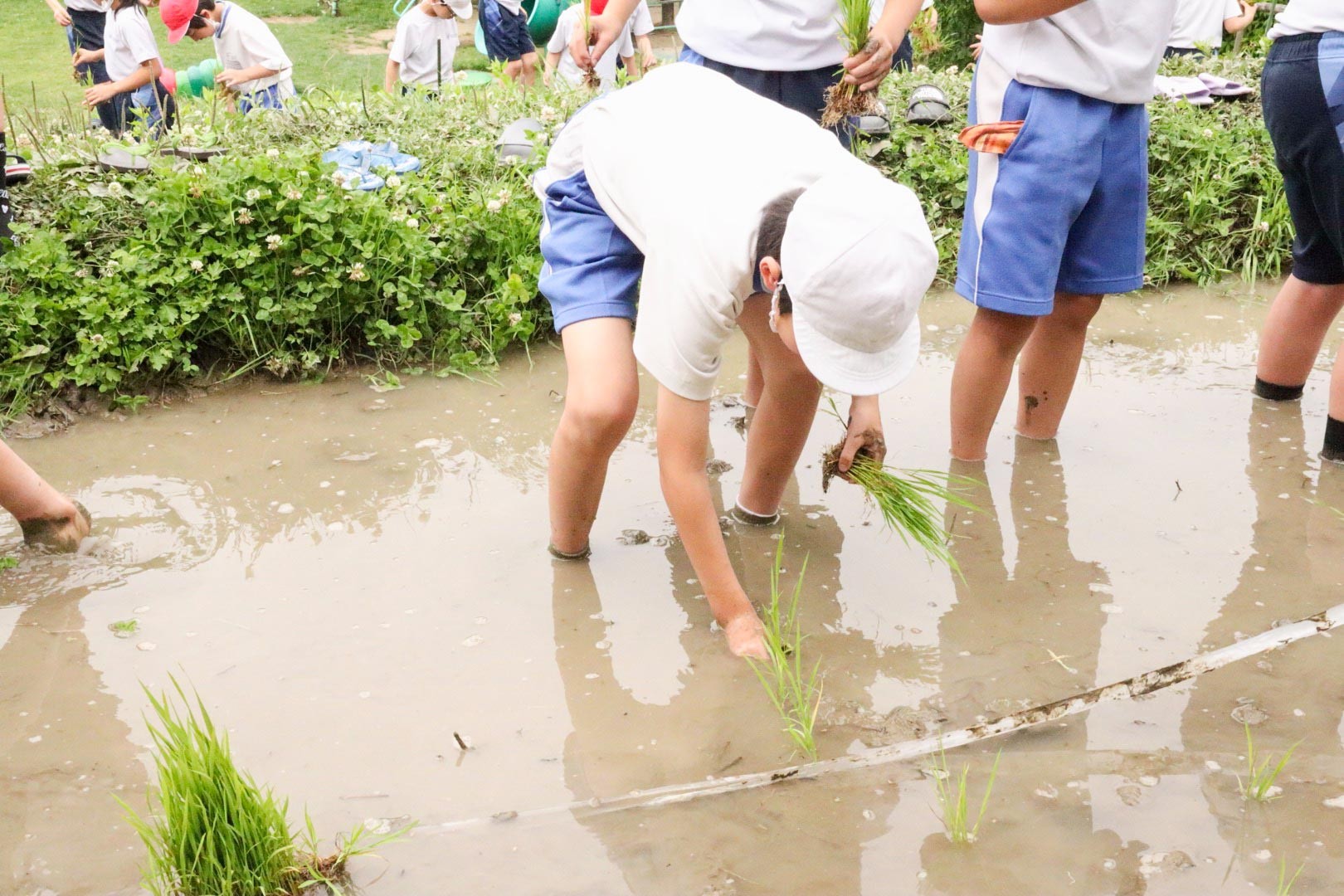 P3(小学3年)生、P4(小学4年)生が本校敷地内の棚田で田植えをしました。
