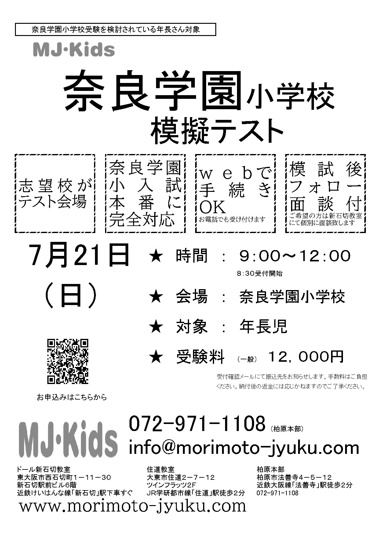 7/21(日)MJキッズ主催の「奈良学園小学校模擬テスト」が本校で実施されます 2024.06.01(土) Tweet ◇PDFを開く 7月21日(日)に、MJキッズ主催の「奈良学園小学校模擬テスト」が本校で実施されます。 申込方法等の詳細につきましては、下記PDFからご覧ください。 « 清掃出張授業を行いました P3、P4生が田植えをしました »