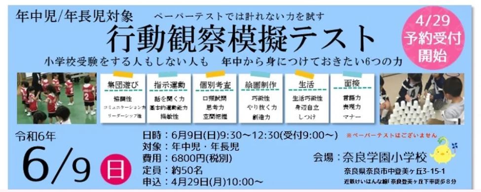6/9(日)関西私立小学校入試体験テスト会主催「集団行動観察模擬テスト」が本校で実施されます 2024.05.23(木) Tweet 6月9日(日)関西私立小学校入試体験テスト会主催「集団行動観察模擬テスト」が本校で実施されます。 申込方法等の詳細につきましては、こちらからご覧ください。 « ならがくプレスクール国語・算数with給食試食会を開催しました P3生が春の遠足に行ってきました! »