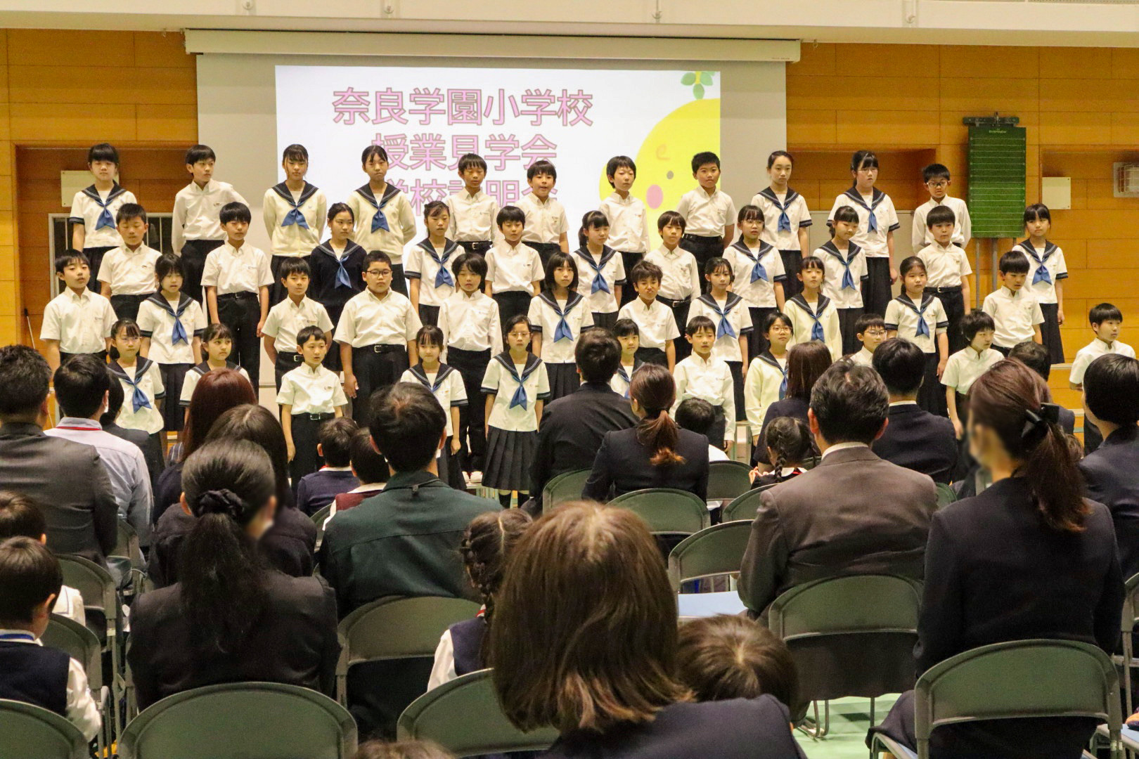 はじめに、M1(小5)生が前に設置した雛壇に立ち、奈良学園小学校の校歌、続いて『友だちだから』の合唱を披露しました。