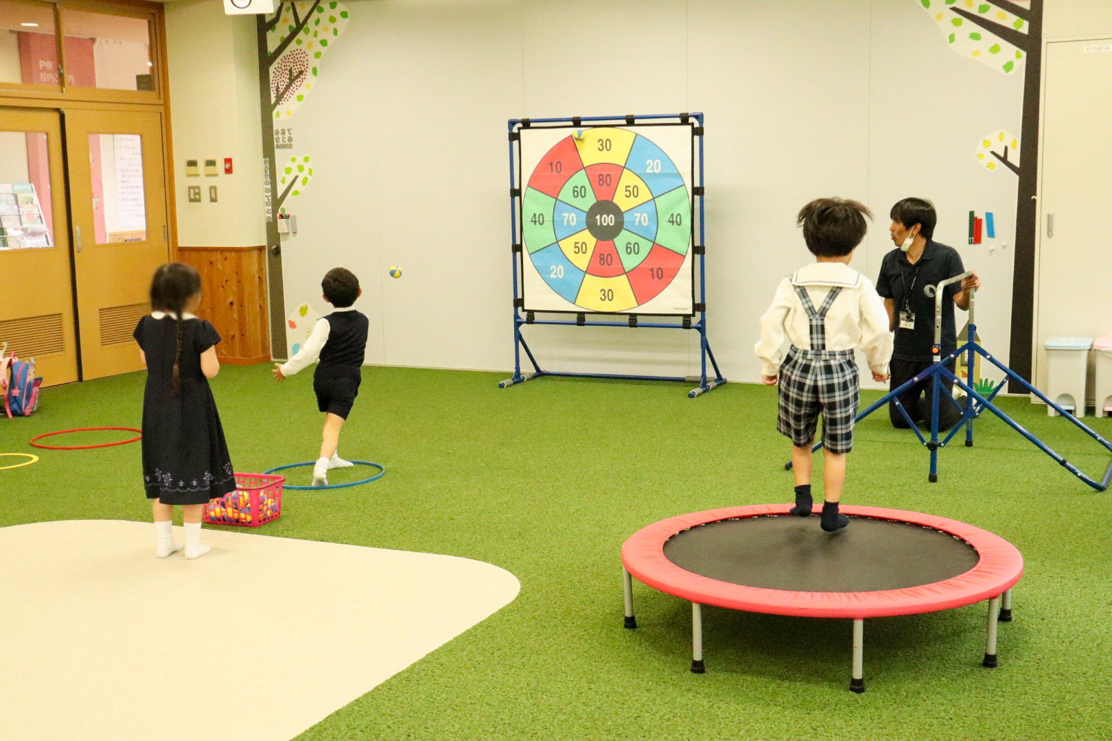 学校説明会の間に、子どもたちは体づくりストレッチと工作体験を行いました。体づくりストレッチでは、ケンパ遊び、ボール投げ遊びやトランポリンなどを置いて作ったサーキットを周回し、しっかりと体を動かして楽しく時間を過ごしました。工作体験では、ネコの形をハサミで切り取って、足の部分を折ることで、上から落としても真っ直ぐに立つ紙細工をしました。