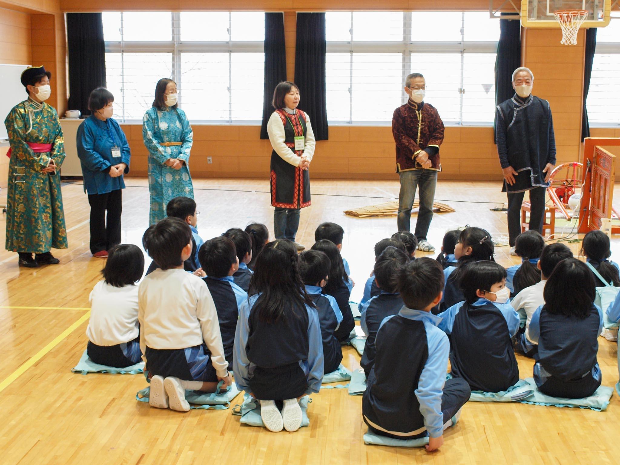 P2(小学2年)生がモンゴル体験を行いました。国語で学んでいる『スーホの白い馬』に関連して、モンゴルパートナーシップ研究所の皆さんをお招きし、モンゴル文化に触れました。