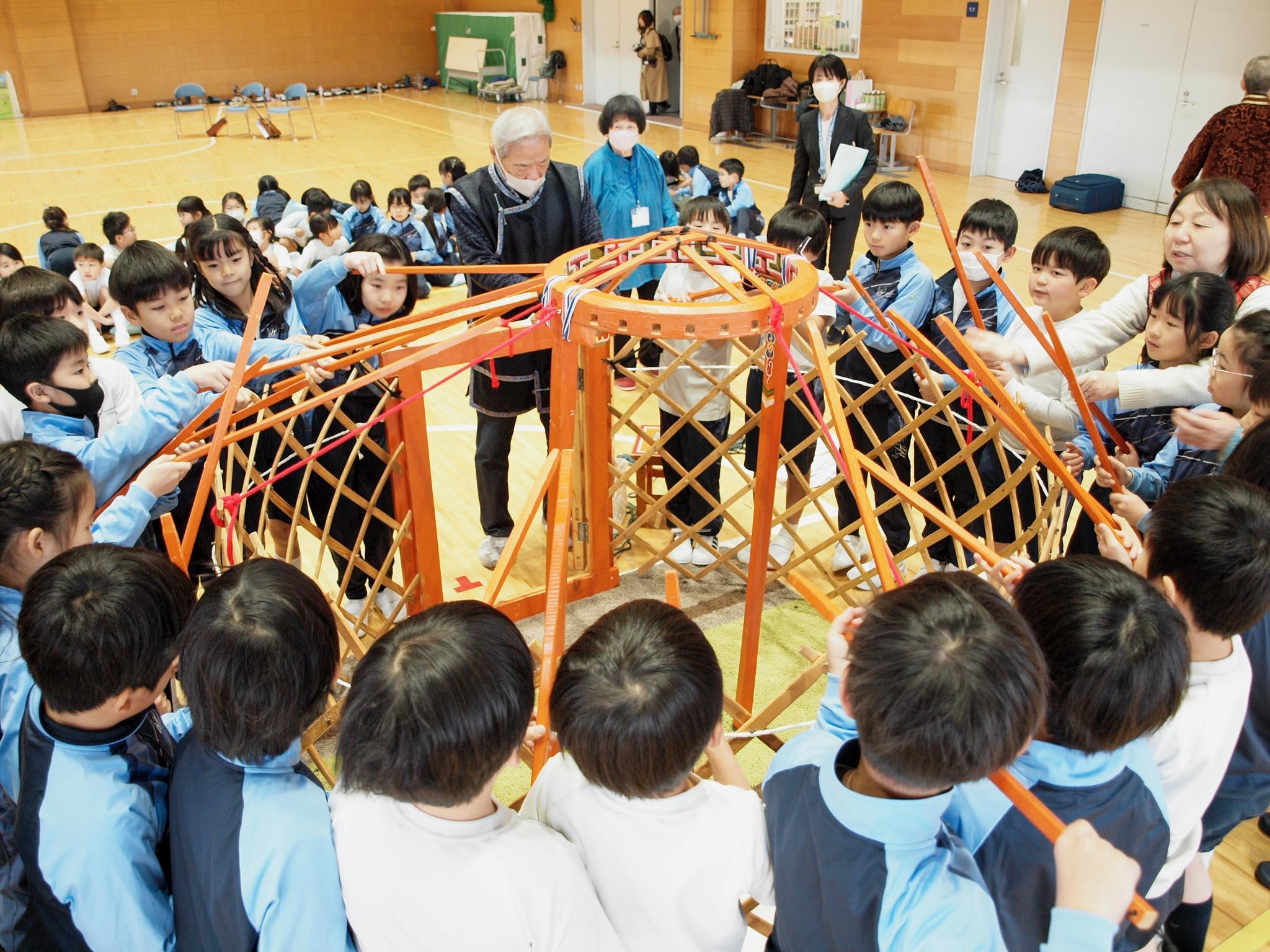 はじめにモンゴルの伝統的な生活についてお話をうかがいました。モンゴルの遊牧民はゲルという組み立て式の住居に暮らし、年に数回の引っ越しを重ねながら牛や馬、羊などの家畜を育てて暮らしています。児童からは、「ゲルに鍵はありますか?」という質問が出ましたが、「鍵はついていますが、かけることは少なく、誰もいなくても、旅人が休めるようにお茶とお菓子をテーブルに置いてあるんですよ」と話していただきました。他にもたくさんの質問が出た後、みんなでゲルの屋根の骨組みの組み立てを手伝いました。最後に全体を白いカバーで覆うと完成です。
