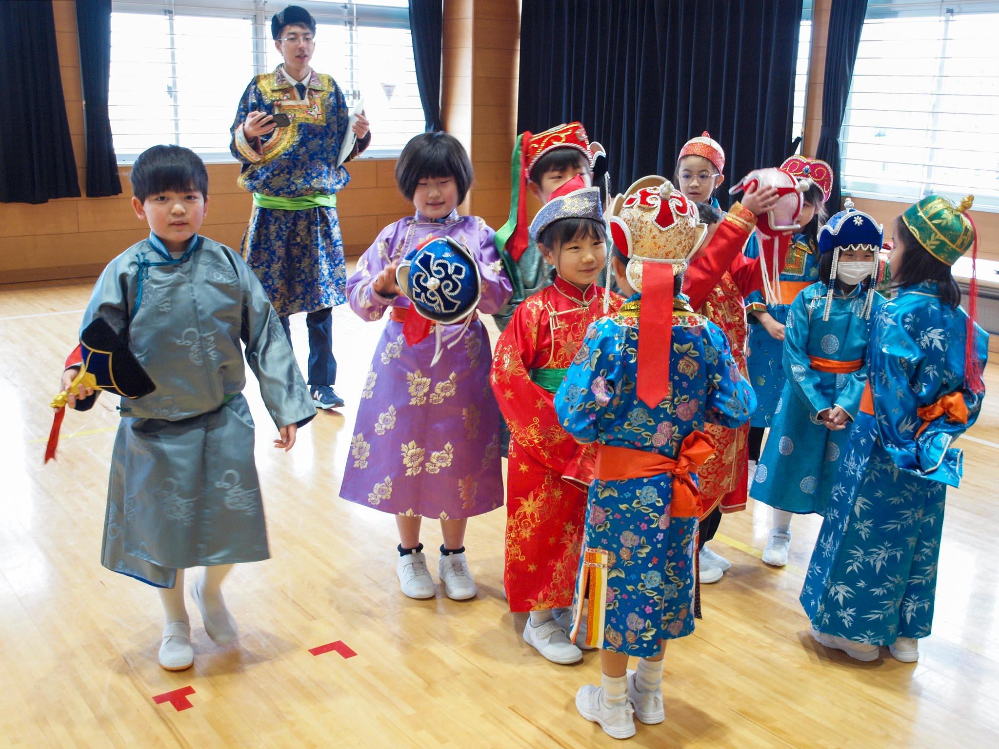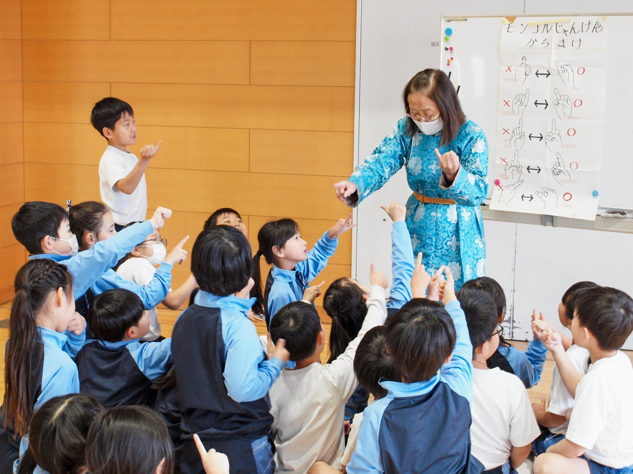 次に3チームに分かれて、ミニゲル、伝統衣装、馬頭琴、モンゴルのじゃんけんを体験しました。見た目よりたくさん人が入れるゲルにみんな大喜びです。きらびやかな刺繍を施した伝統衣装のデールを着付けてもらい、記念撮影もしました。馬頭琴は『スーホの白い馬』で描かれる非常に重要な楽器です。演奏の姿勢や弓の動かし方を習い、一人一人が実際の馬頭琴に触れて、馬の尾毛を張った弦が奏でる音を聴くことができました。伝統衣装を身に着けた担任の先生vsクラスのみんなでモンゴルじゃんけん対決もしました。