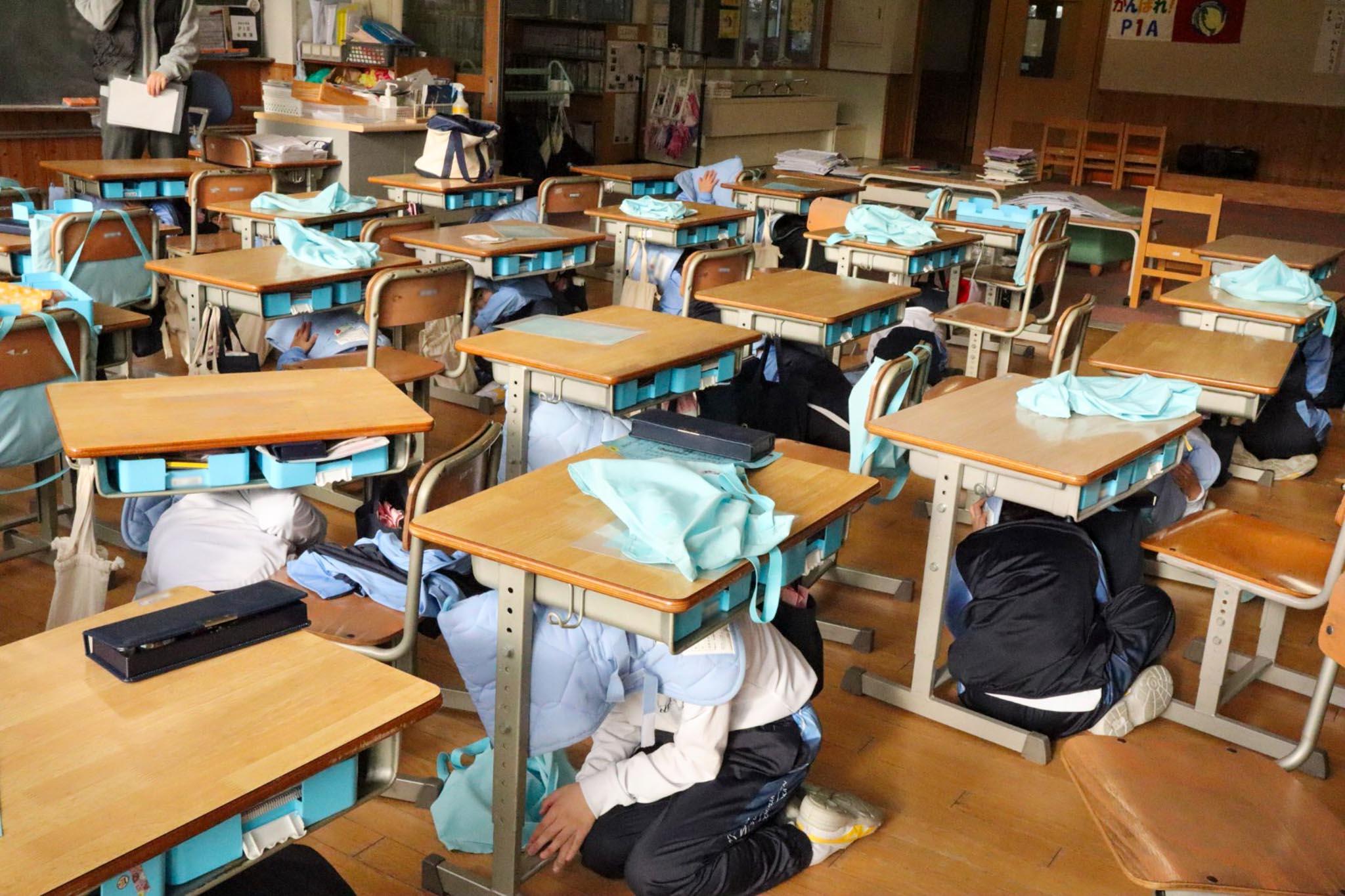 校内放送で大きな地震が発生したことが知らされました。児童たちは直ちに自分の机の下に潜り込み、はみ出さないように丸くなって先生の指示を待ちます。しばらくして「1階厨房より火災が発生しています」とアナウンスがありました。児童たちは、先生の指示を聞いて教室から安全に避難する訓練をしました。