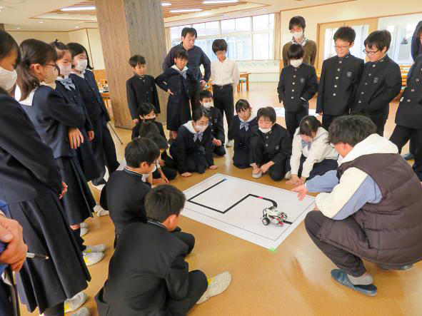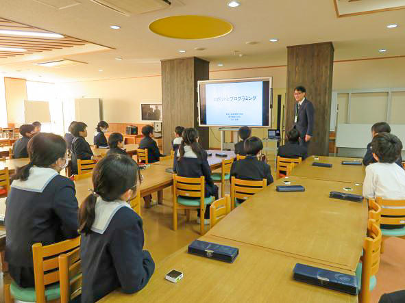 最初に、奈良工業高等専門学校 電子制御工学科 玉木隆幸先生から、ロボットの仕組みについての講義がありました。その後、M1生は実際にプログラムを作成して、ロボットを指示どおりに動かす課題に取り組みました。