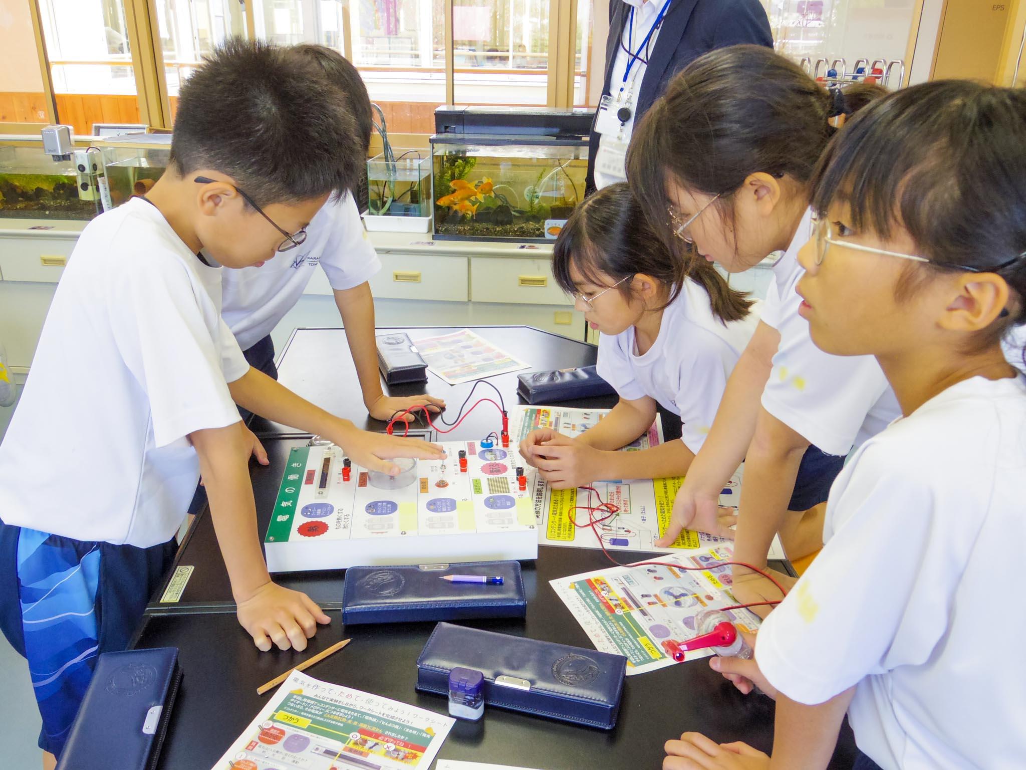 手回し発電機を用いて電気を作る実験では、コンデンサに電気を蓄え、扇風機を動かしたり、豆電球とLED電球の違いを確かめたりしました。