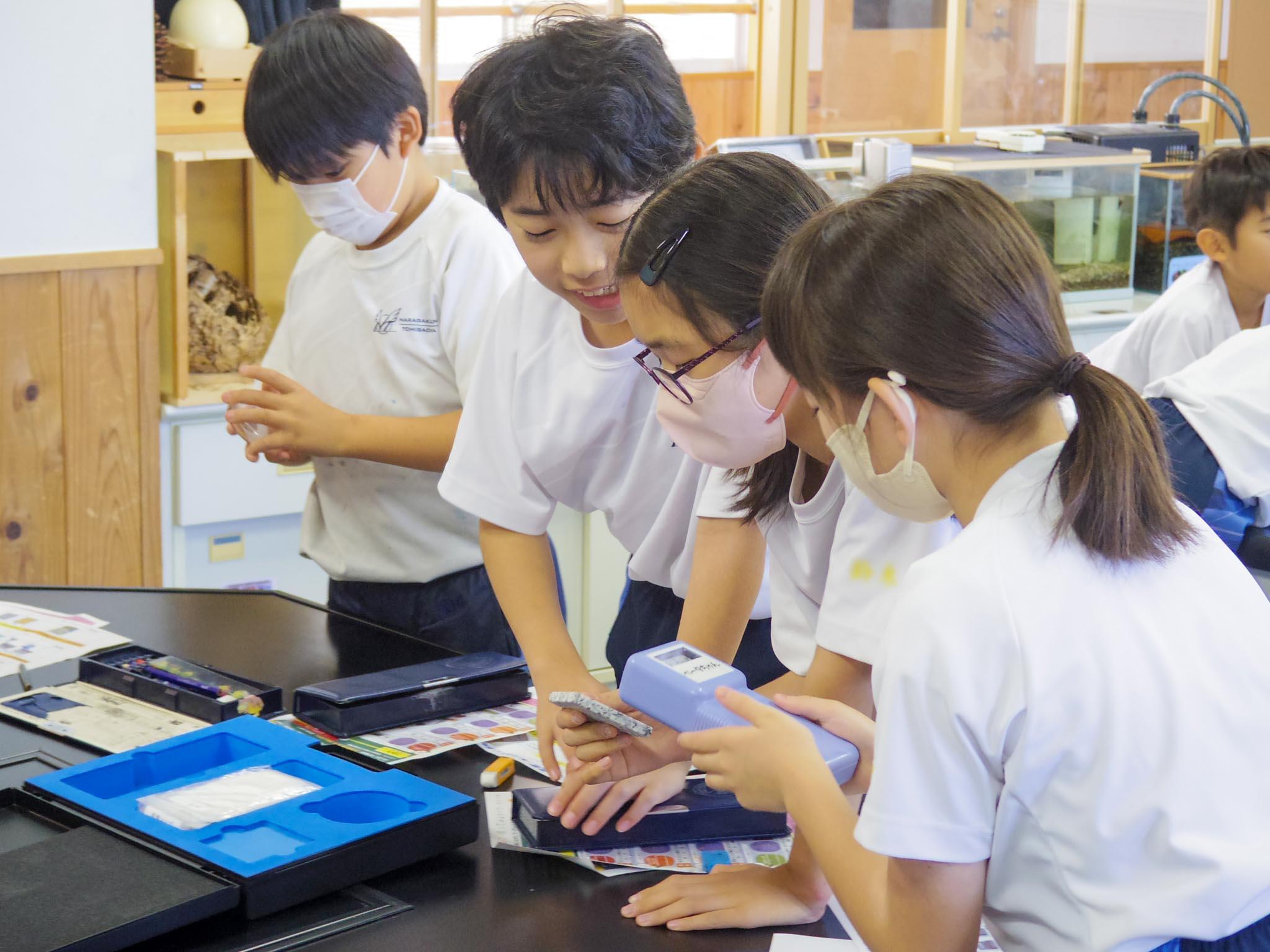 実験では2種類の放射線測定器を使って、さまざまな物が発している放射線や、身近な環境の放射線を測定しました。また、鉄板や紙で覆って再度測定し、遮へいして放射線量を比べました。