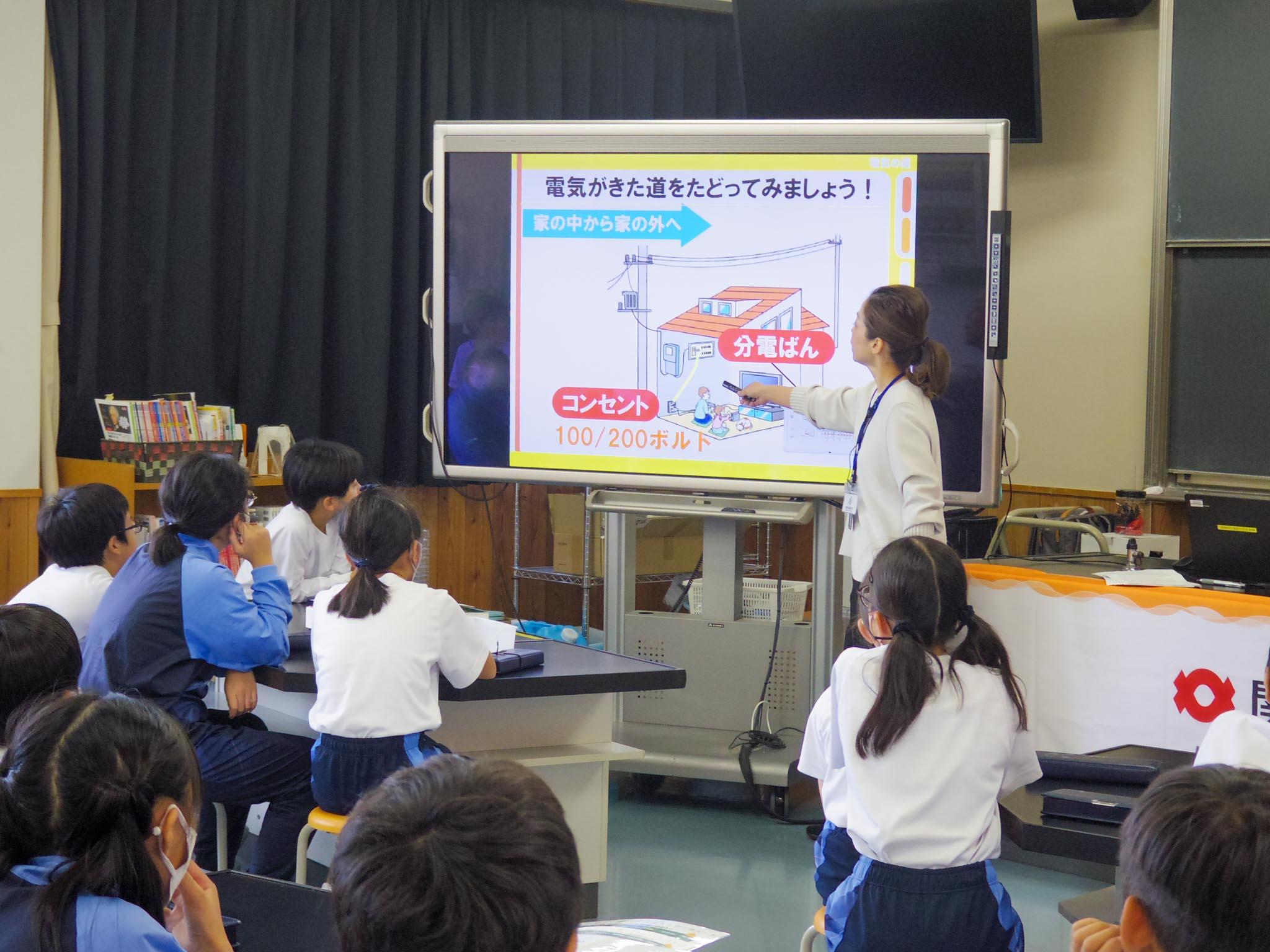M1(5年)生を対象に、理科の出前授業を行いました。講師に関西電力の皆様を迎え、生活に欠かせないエネルギーである電気について講義していただきました。