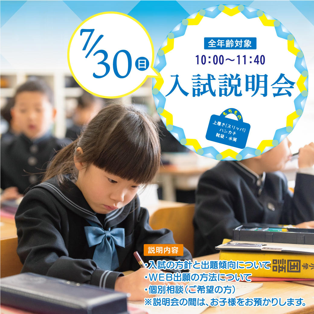 7/30(日)A日程入試説明会のご案内 2023.06.23(金) Tweet 7月30日(日)にA日程入試説明会を開催します。 日時:7月30日(日) 10:00~11:40 内容:入試の方針と出題傾向について WEB出願について « テスト体験会を行いました P4生が美山へ宿泊学習に行ってきました »