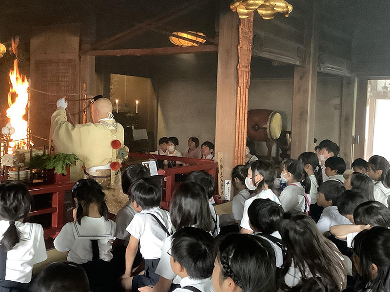 まずは櫻本坊で、護摩木に書いた祈りを「護摩焚き」してもらいました。予想以上に大きい炎、白い煙、そして太鼓の音と振動に驚いていました。