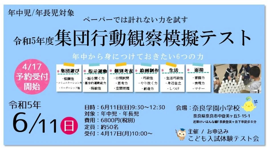 6/11(日) 関西私立小学校入試体験テスト会主催「集団行動観察模擬テスト」が本校で実施されます 2023.05.09(火) Tweet 6月11日(日)に関西私立小学校入試体験テスト会主催「集団行動観察模擬テスト」が本校で実施されます。 申込方法等の詳細につきましては、こちら からご覧ください。 « 5/21(日)あべのハルカス近鉄本店「キッズフェスタ2023」に参加します 転入学児童募集要項を掲載しました »
