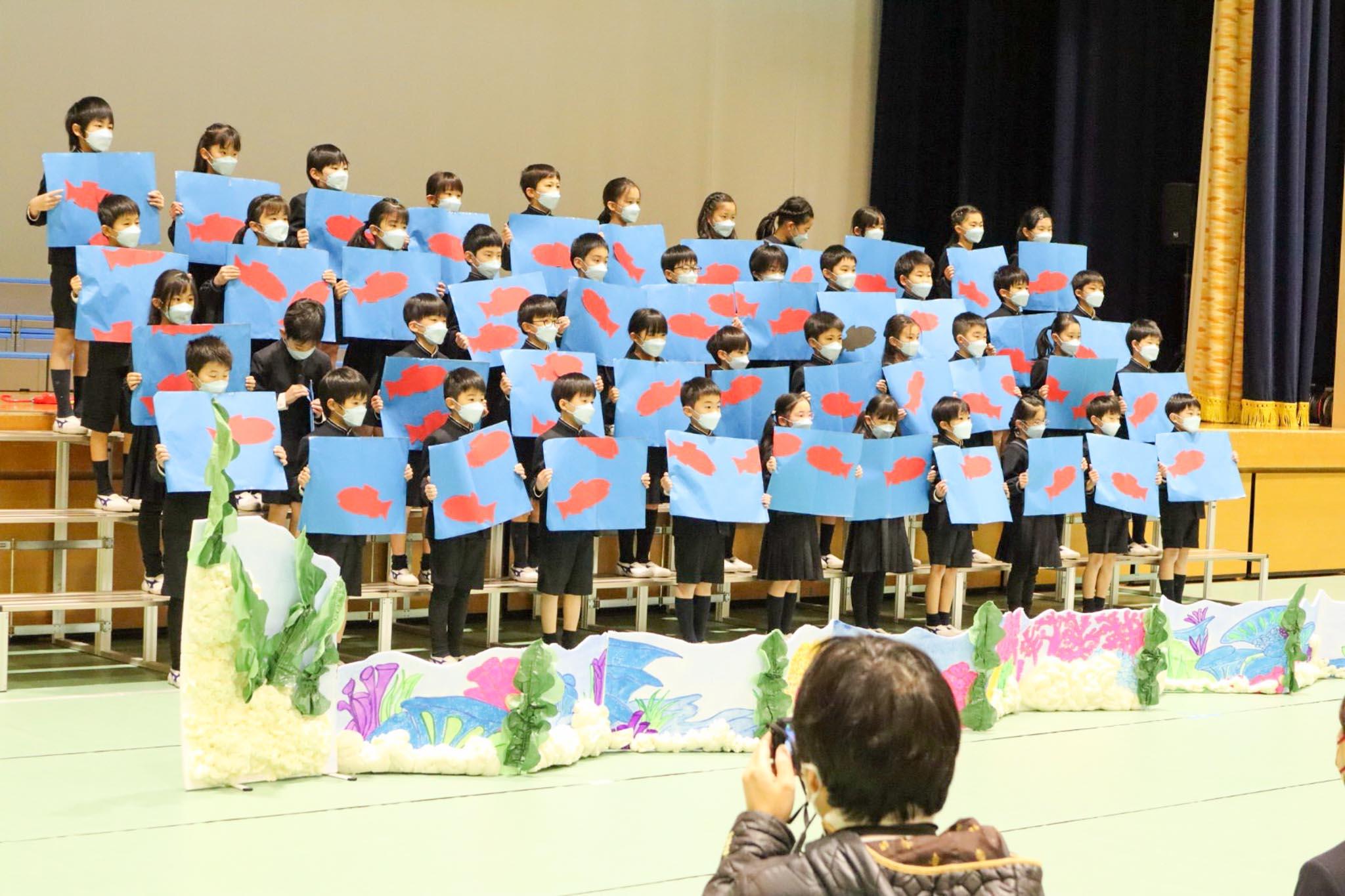 P2(小2)生は音楽物語「スイミー〜小さなかしこい魚の話〜」です。セリフと歌を交えながら、物語に合わせて色画用紙で作られたパネルを一人ひとりが広げ、海の中の世界を表現し、まるで大きなスクリーンのように見せてくれました。
