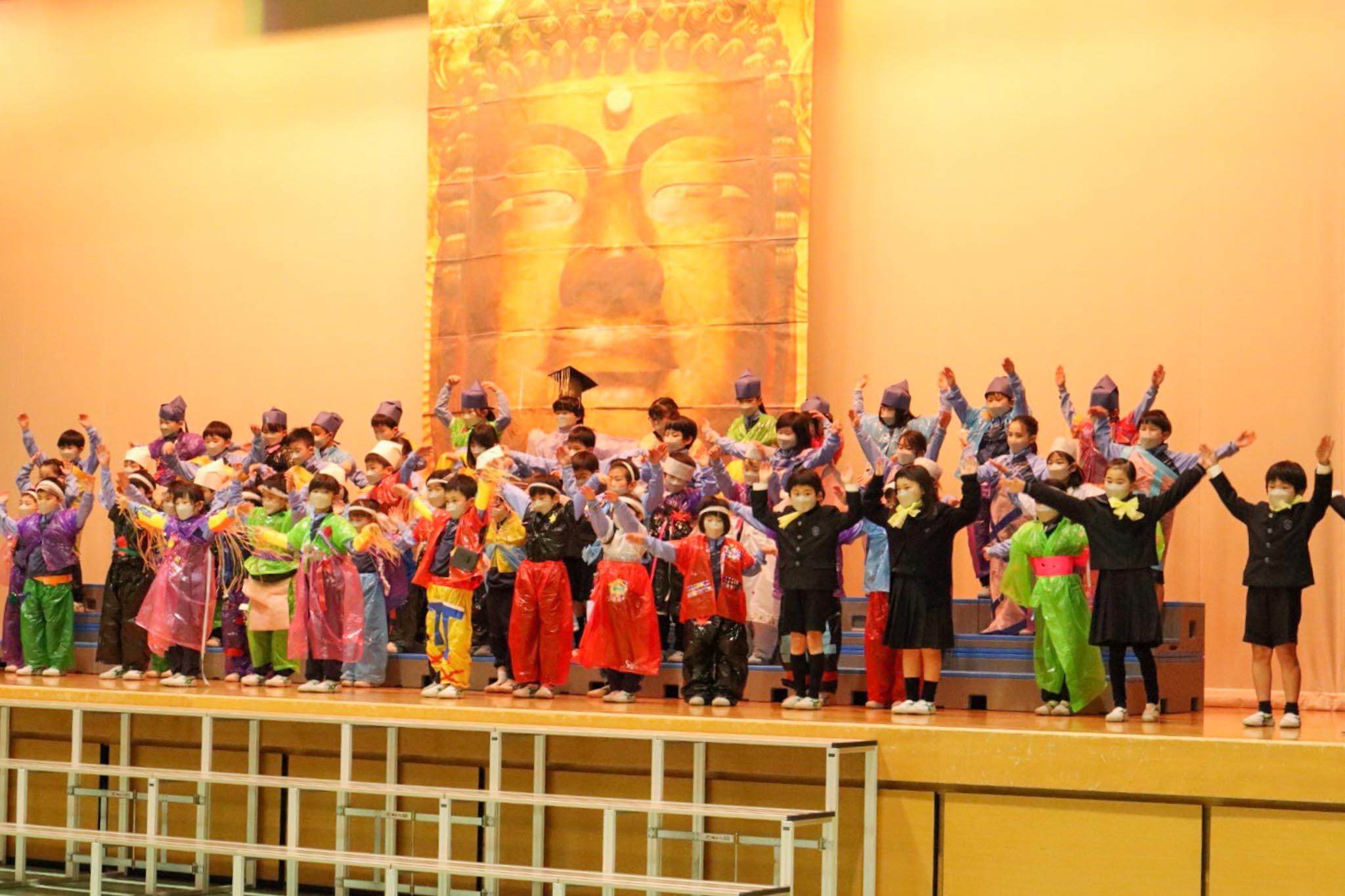 P1(小1)生は劇「大仏ができるまで」を発表しました。手作りの奈良時代の衣装を着て、みんなで力を合わせて奈良の大仏を作るまでのお話を劇で発表しました。すばらしい劇に保護者席から大きな拍手がありました。