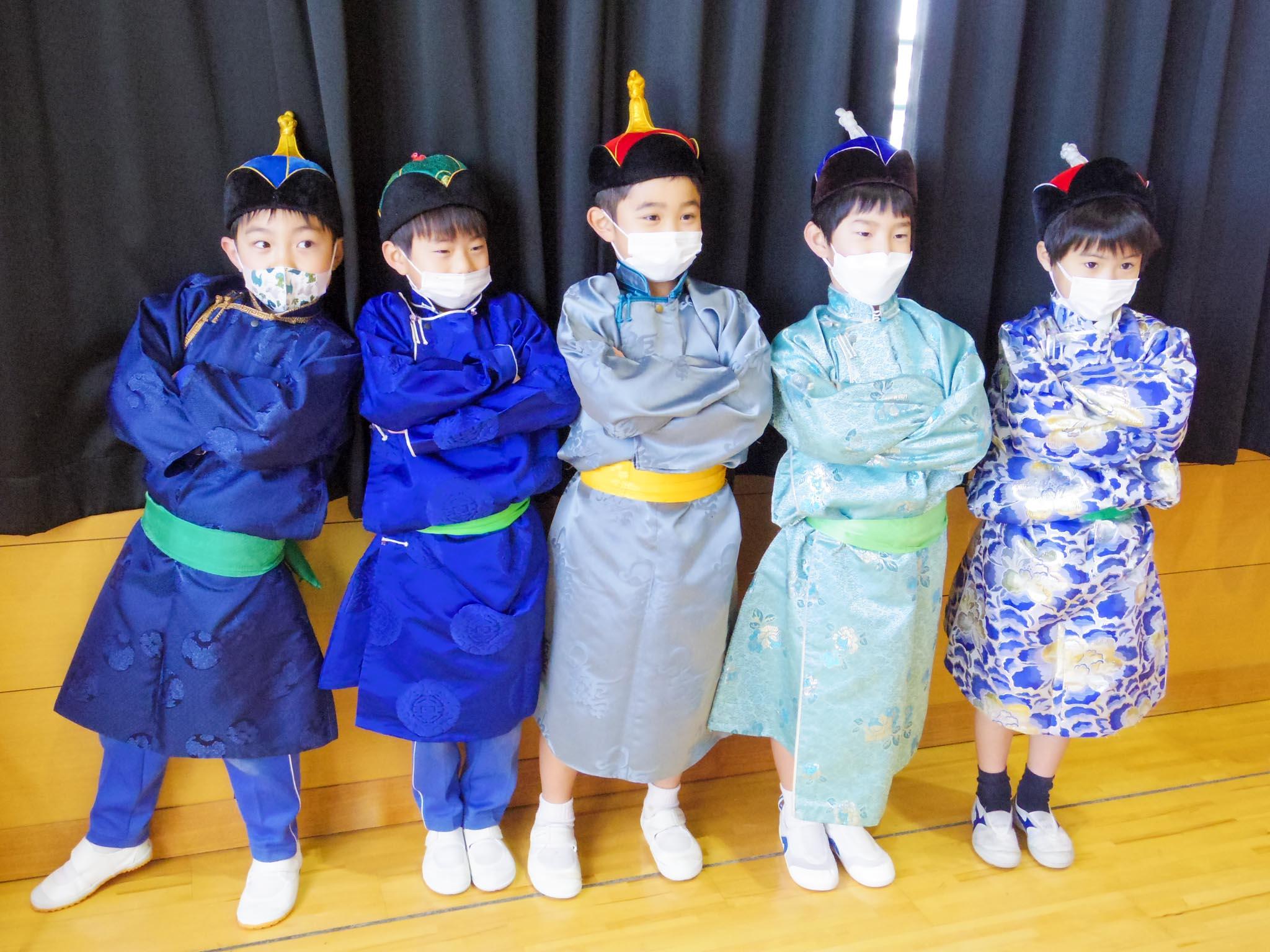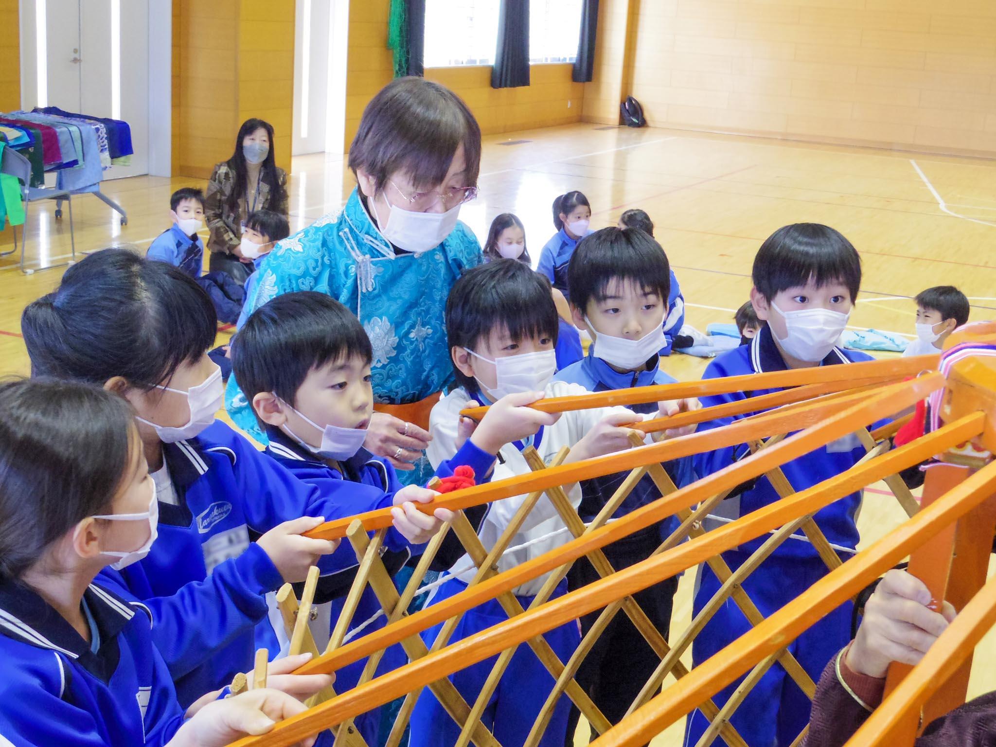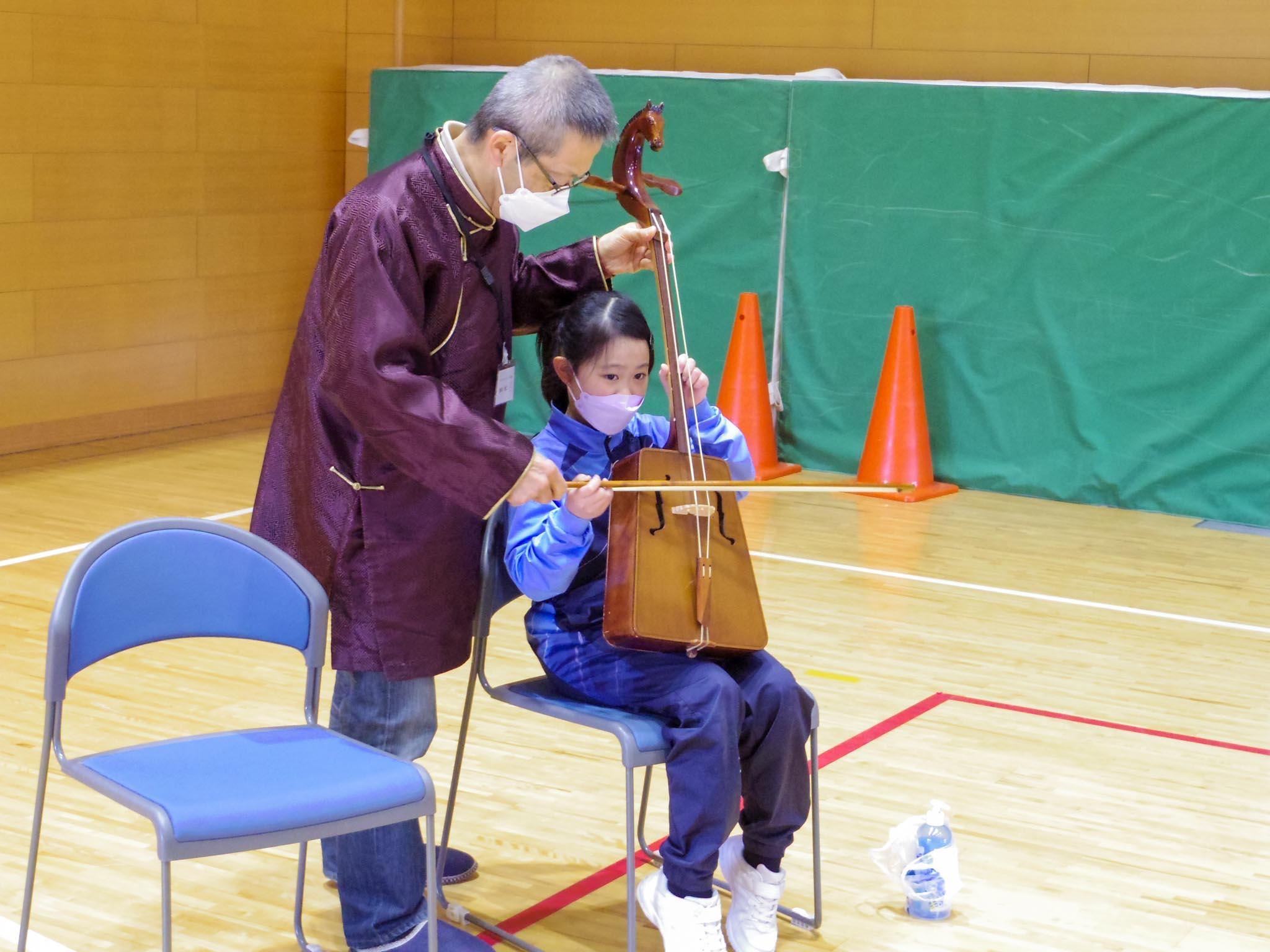 次に3チームに分かれて、ミニゲル、伝統衣装、馬頭琴の3つを体験して回りました。ミニゲルの中に入った児童たちは、とてもわくわくした様子です。また、5本の指を使って遊ぶモンゴルじゃんけんのやり方も教わりました。馬頭琴は『スーホの白い馬』で描かれる非常に重要な楽器です。今日の馬頭琴はおもに木製ですが、演奏の姿勢や弓の動かし方を習い、一人一人が実際の馬頭琴に触れて、馬の尾毛を張った弦が奏でる音を聴くことができました。伝統衣装のデールはきらびやかな刺繍を施した衣服です。美しく飾られた帽子を選んでかぶり、記念撮影をしました。普段の教室を飛び出して、生き生きと文化に触れる特別授業でした。