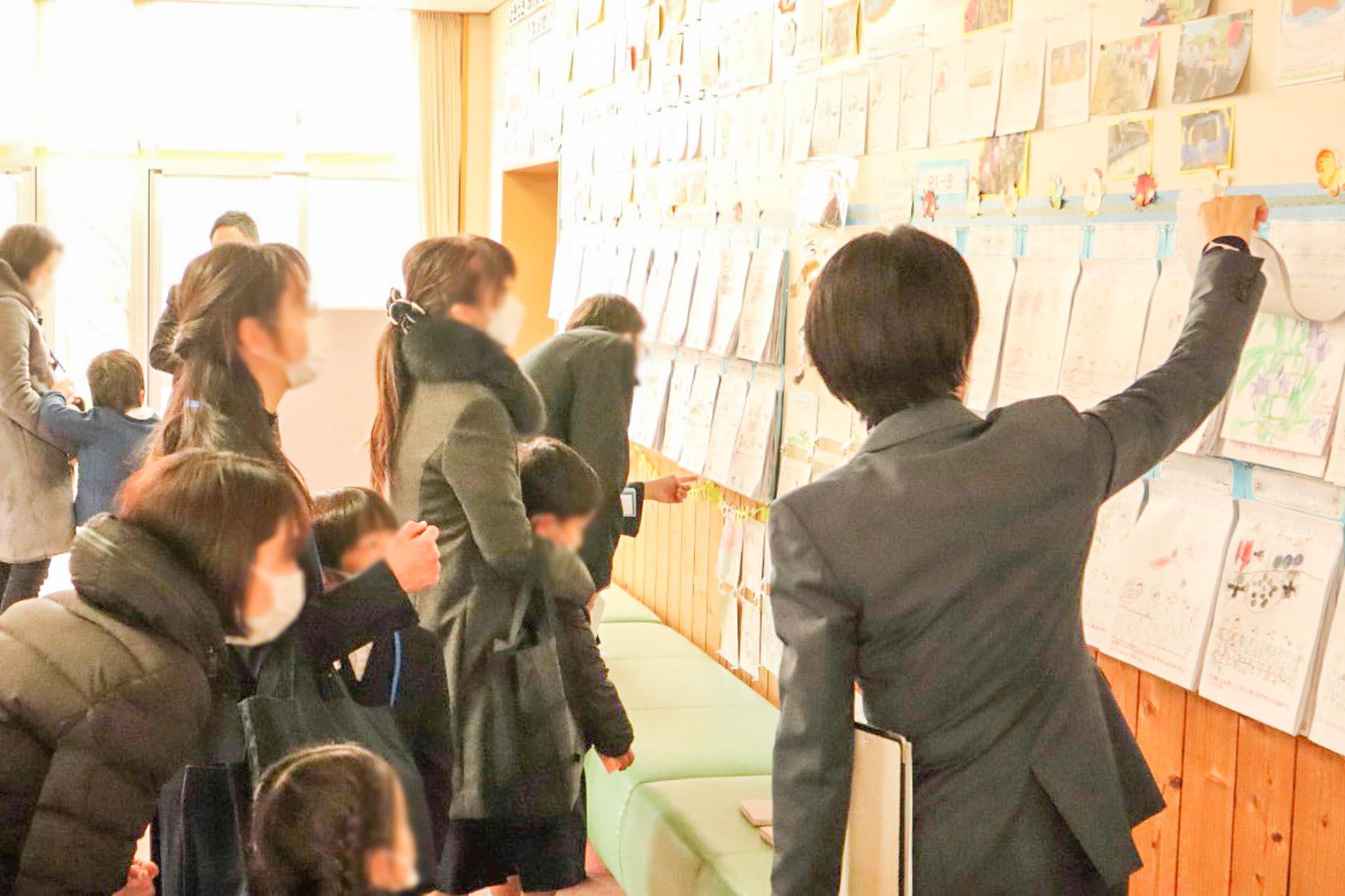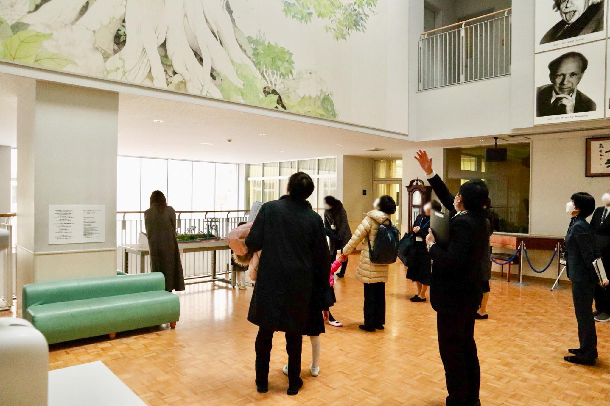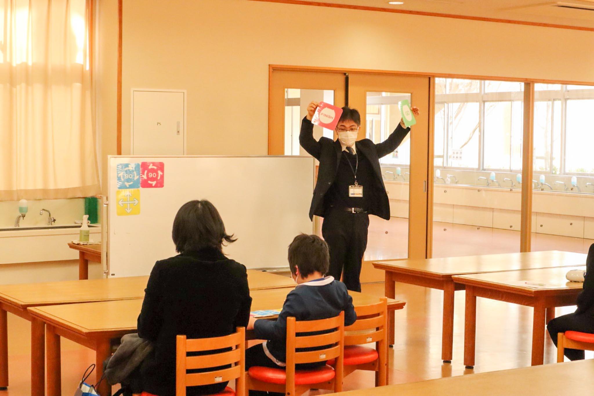 年中・年長児とその保護者の方を対象に、見学ツアー&授業体験を開催しました。まず、梅田校長から「子どもたちが色々なものを体験しながら学べるよう、学年ごとにさまざまな宿泊学習を実施しています。教室だけでは学べない体験学習や発表の場を設けています。本日はツアーの中で授業の様子も見ていただき、子どもたちが学びに向かう空気を感じ取っていただければと思います」と、挨拶がありました。