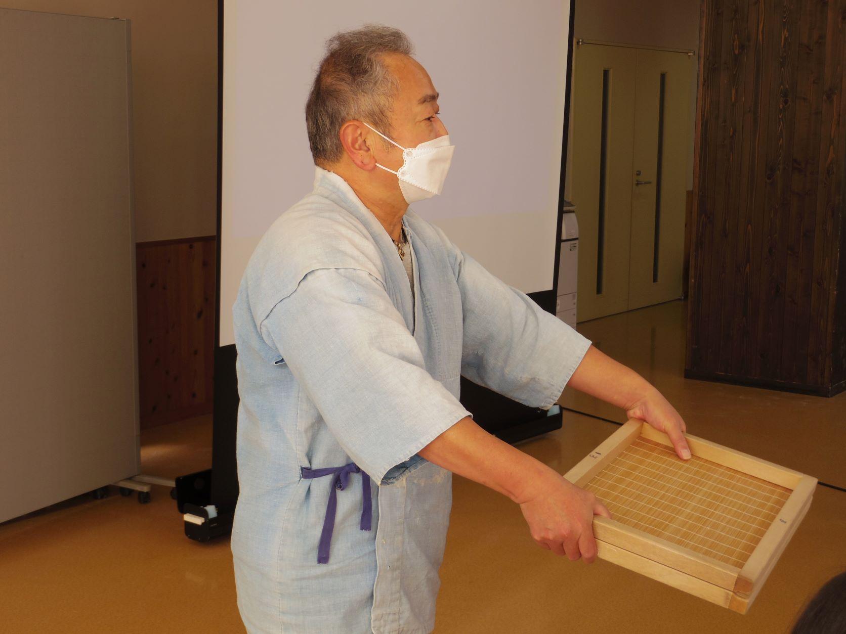 講師は吉野手漉き和紙の職人である福西和紙本舗の福西正行さんです。奈良国立博物館や、なら芸術歴史文化村の収蔵物を修復するための和紙も作っていらっしゃいます。福西さんは「毎年この小学校に来るのを楽しみにしています。和紙は100年200年ときれいに残る紙です。おうちの人のことを考えながら和紙を作ってください」と話されました。