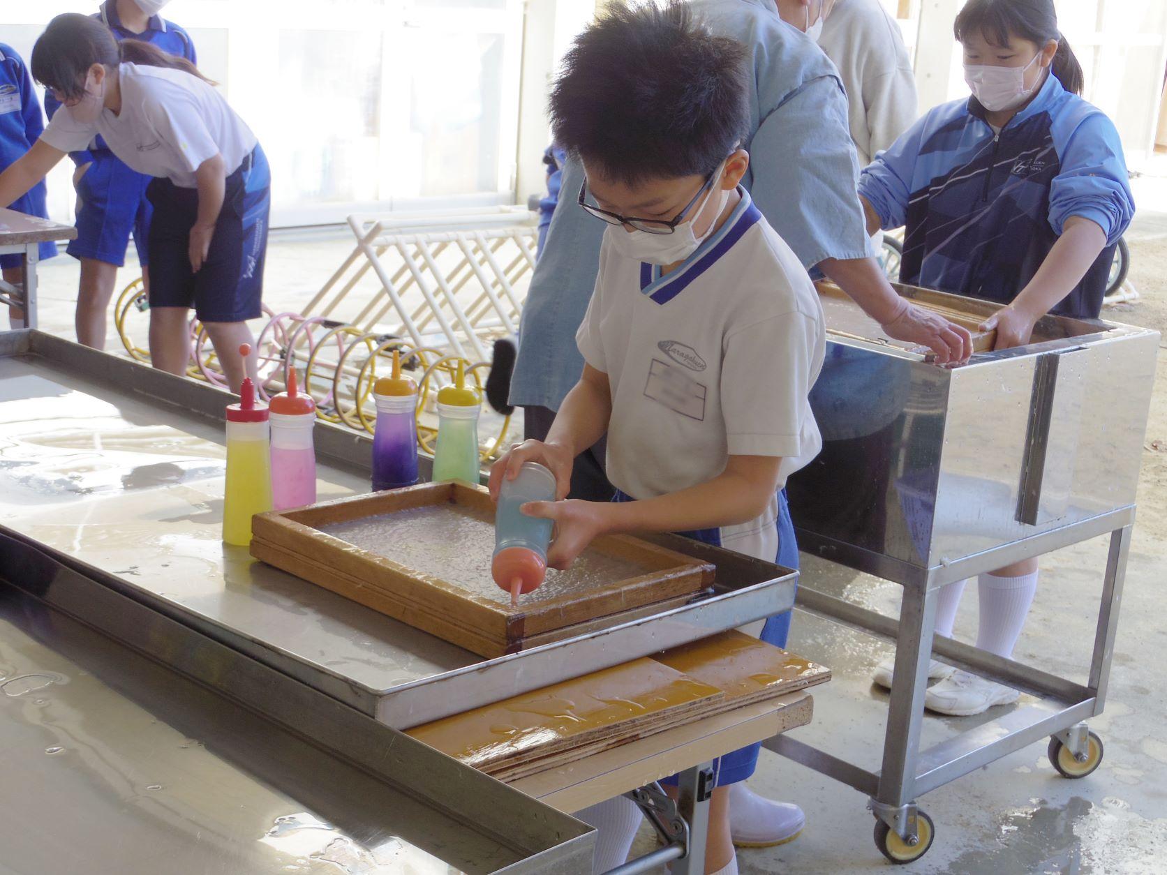 紙漉き体験では、はじめに木枠とすだれで土台となる紙を漉き取ります。おもな原料となるのは楮(こうぞ)と糊うつぎです。福西さんに手伝ってもらい、材料を満たした槽に手を入れたP4生たちは「冷たい!」と驚いていました。和紙は寒い季節ほど良いものができるとのことです。土台を漉いたら、着色の工程に移ります。色の素となるのはネム(黄)、紅花(赤)、サカキの実(紫)、よもぎ(緑)など、こちらもほとんどが天然の材料です。P4生たちはきれいな模様を作ったり、植物や野原などの風景を描いたりと思い思いに彩色していました。