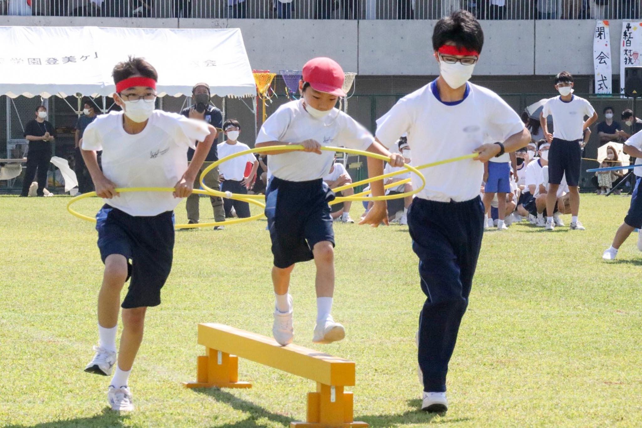 また「フラフープリレー」ではP3、P4とM3、Y2の男子生徒が3人のチームを作り、フラフープの中に入って走ります。年齢が違うお互いの力量を気遣い、顔を見合わせながらゴールを目指しました。