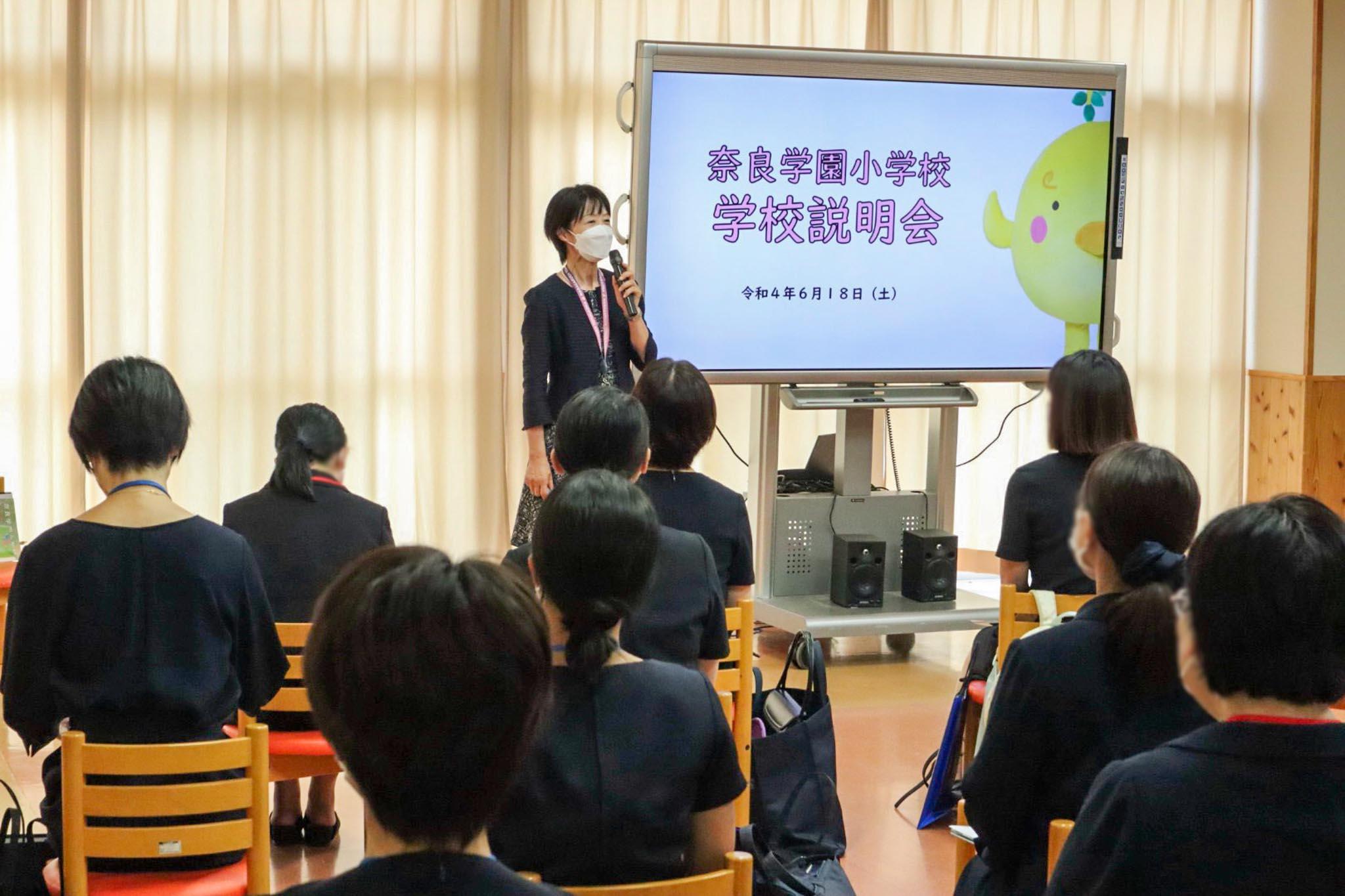 学校説明会にあたり、梅田校長から本校の建学の精神や教育方針の説明があり、その中で「本校では20年後に役立つ力を持つ子どもを育てていきたい。そのために小学校で何を身につけるべきか、どのような生き方をしてほしいかを常に考え続けています」と話しました。