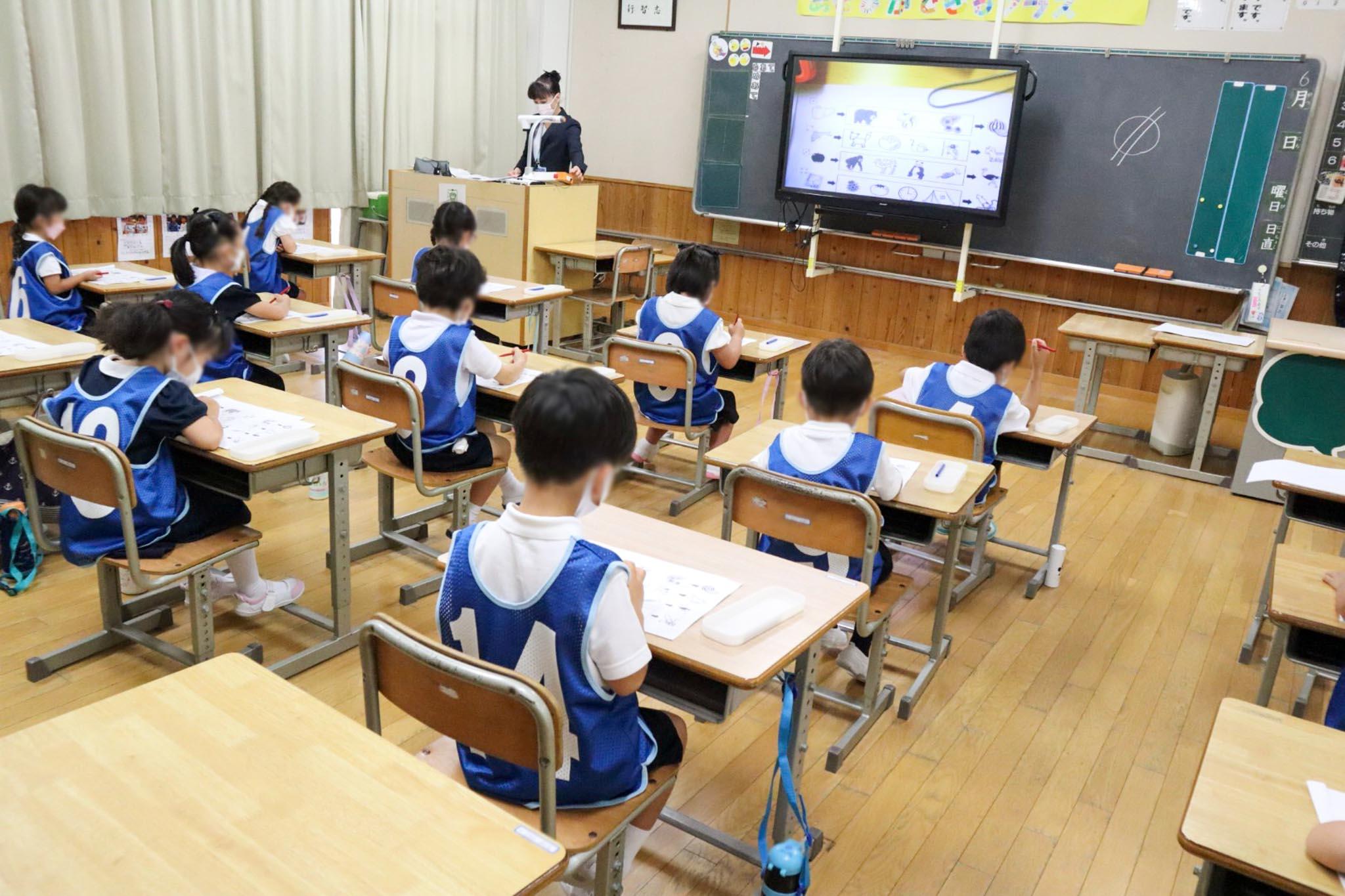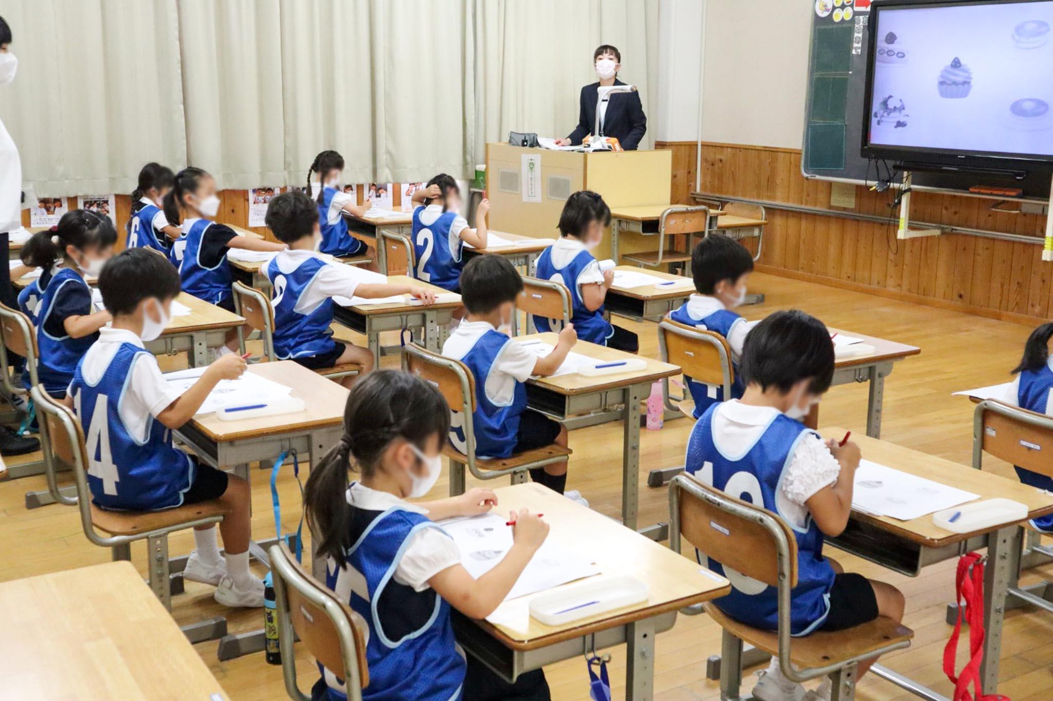 校舎の入り口で受付を済ませると、子どもたちはそれぞれの色のビブスを着用して教室へ入り、さっそくペーパーテストの開始です。