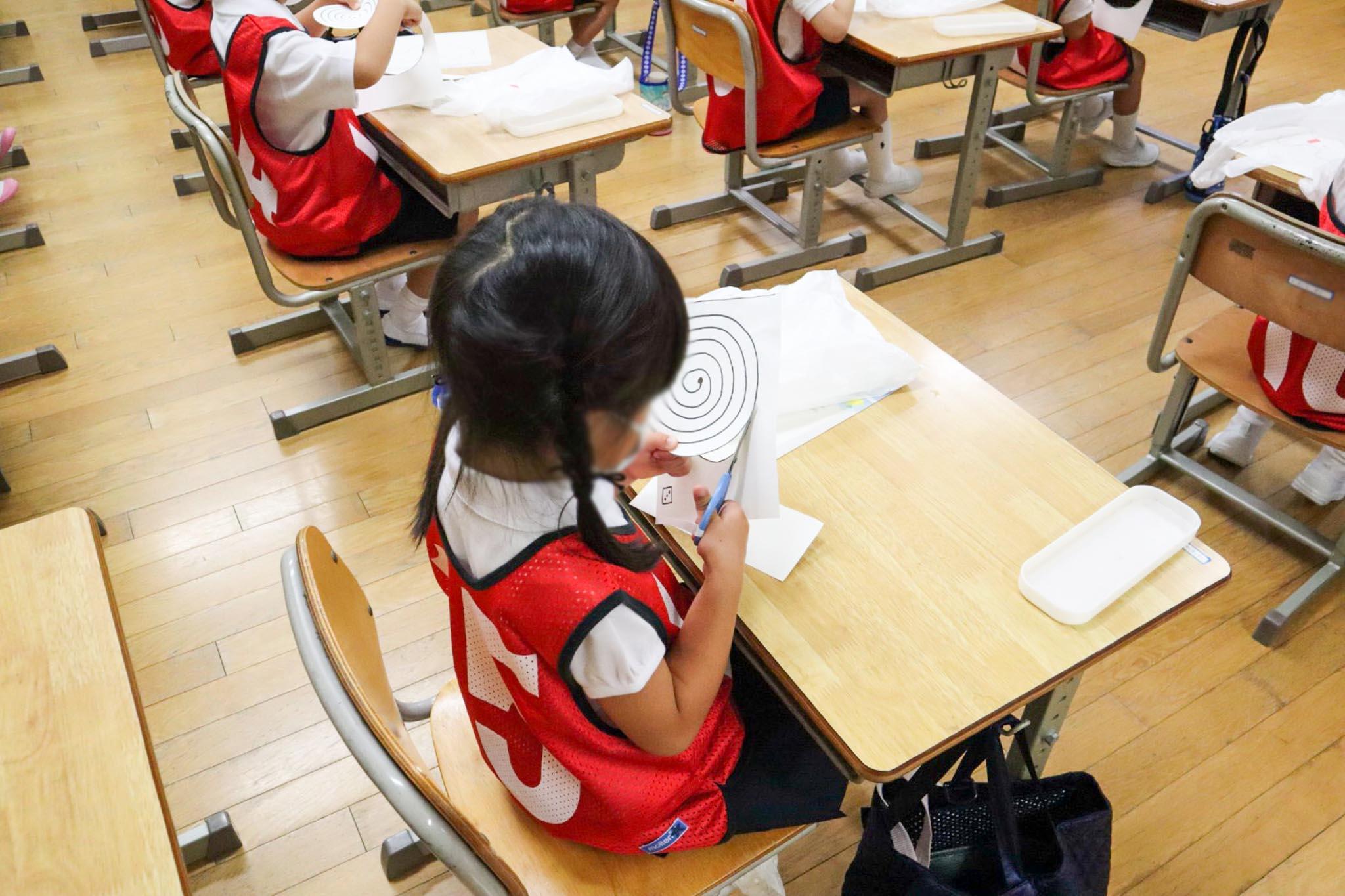 教室では、子どもたちが図形や数についての問題や、絵を見て記憶を試す問題などにチャレンジしていました。また、はさみレッスンでは、はさみを使って、直線や曲線、ジグザク線など、紙を動かしながら線に沿って切り取る課題にも挑戦していました。