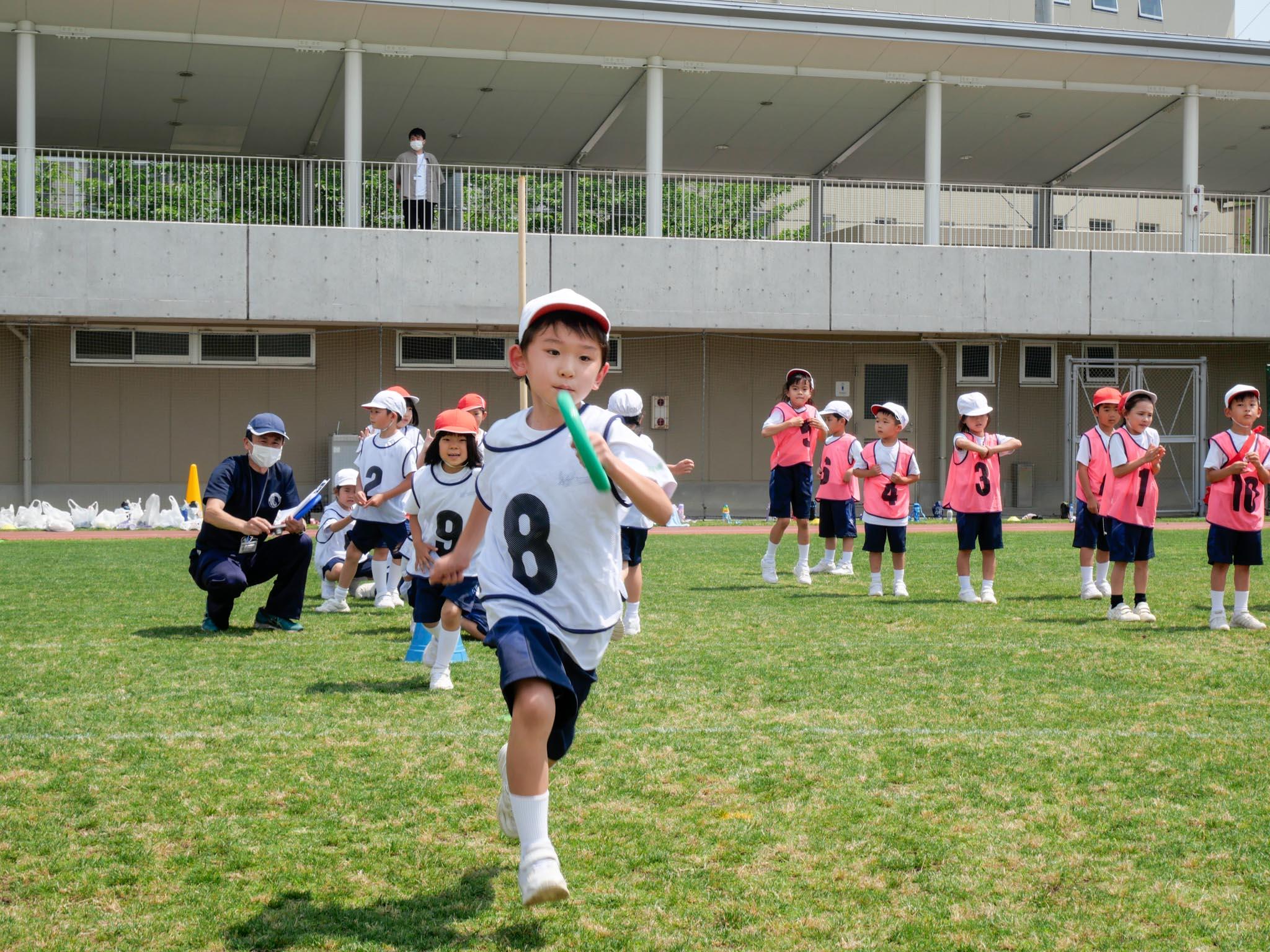 競技の前は、給水タイムが設けられ、熱中症対策を施しての開催です。水分を補給した後、学年毎に距離が違うクラス対抗リレーが行われました。児童たちは青々とした芝生で力いっぱい走りました。