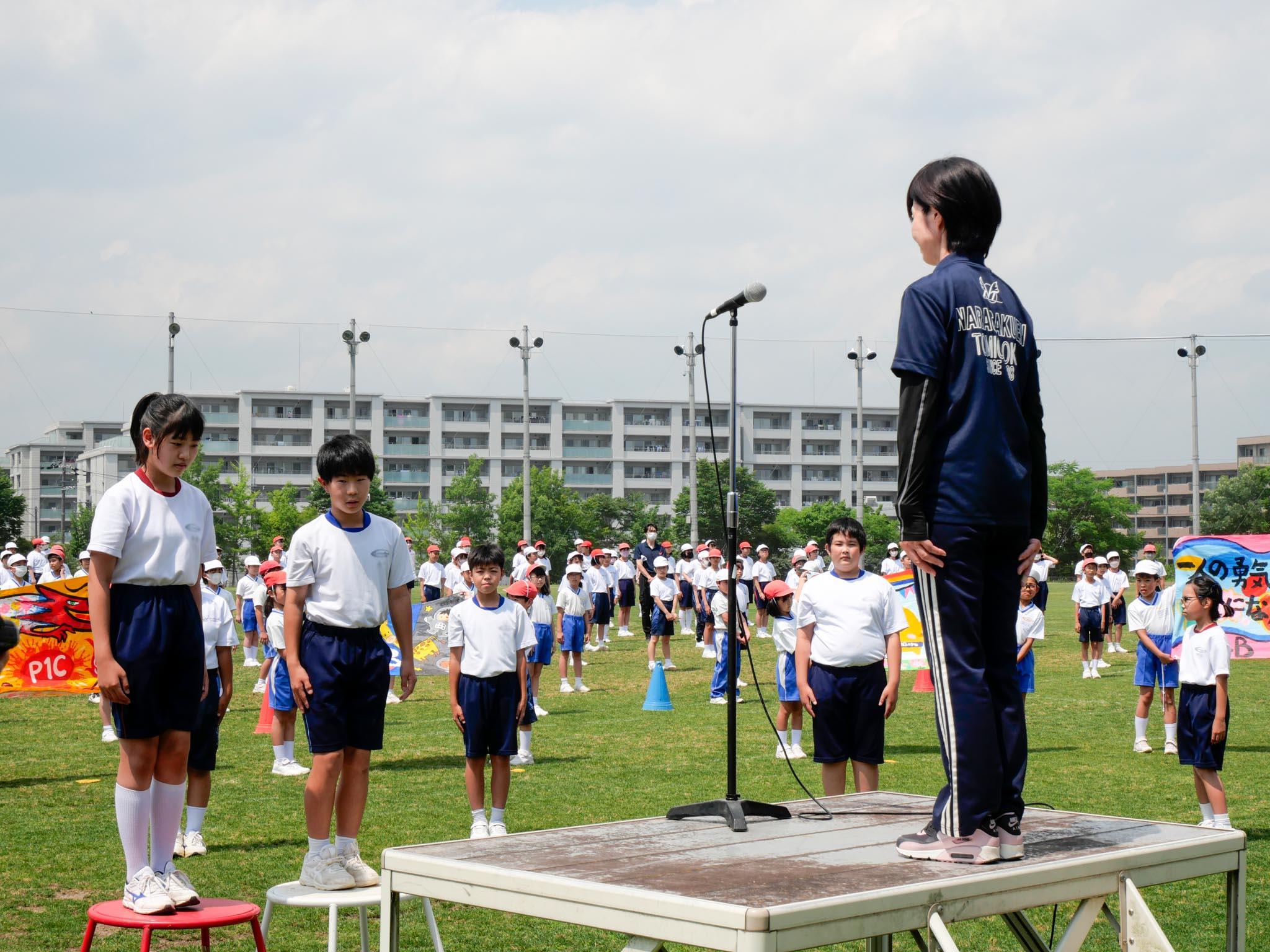 開会式では、M2(小学6年)生の児童代表が、大きな声で『これまでの練習の成果を十分に発揮し、チームメイトと力を合わせて「一生懸命みんなでやり抜け、全力を出しきる”なとみんピック”」のスローガンの下に、最後まで全力で頑張りぬくことを誓います』と選手宣誓をし、校長先生から「みんなで考えたスローガン、そして、誓いの言葉、しっかりと受け止めました」と激励の言葉がありました。
