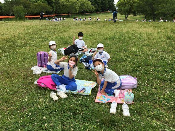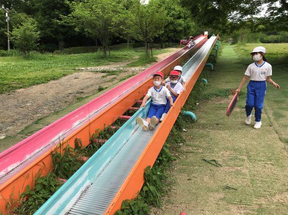 P3生の春の遠足ではグループで協力して動くことが目的です。到着すると、早速グループに分けれて、それぞれの遊具などで遊んでいました。特にロング滑り台が人気で、とても見晴らしのいい高台から滑るのがとても楽しかったようです。
