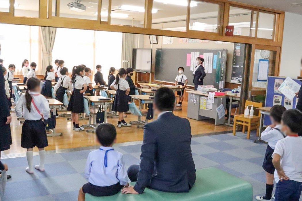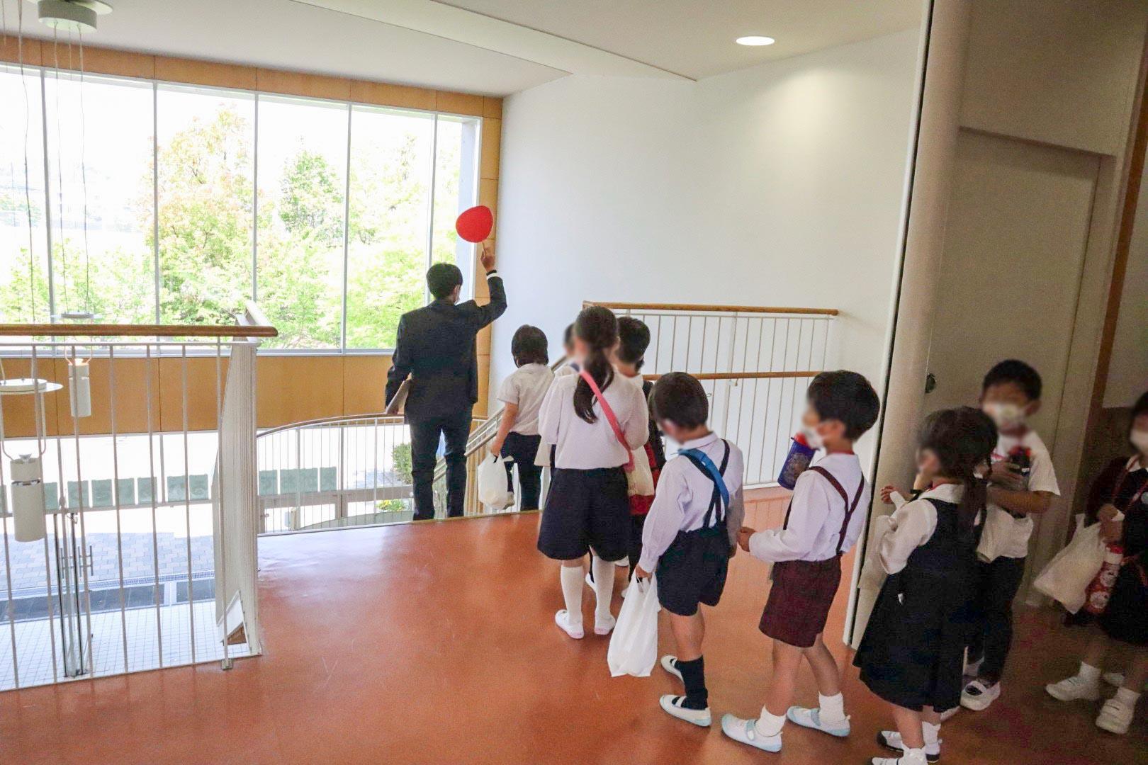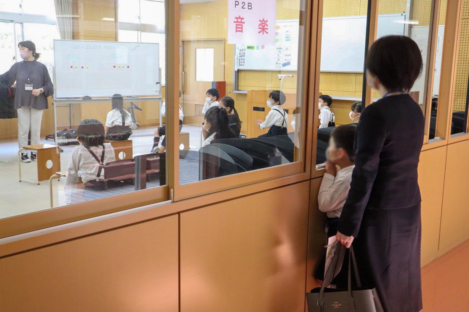 まず、P1(小学1年)~M2(小学6年)の全フロアを自由に見学していただき、実際の授業風景を見ていただきました。音楽室での授業の中で、児童たちが手拍子をするのに合わせ、窓から見学している子どもたちが一緒に手拍子をする様子もうかがえました。