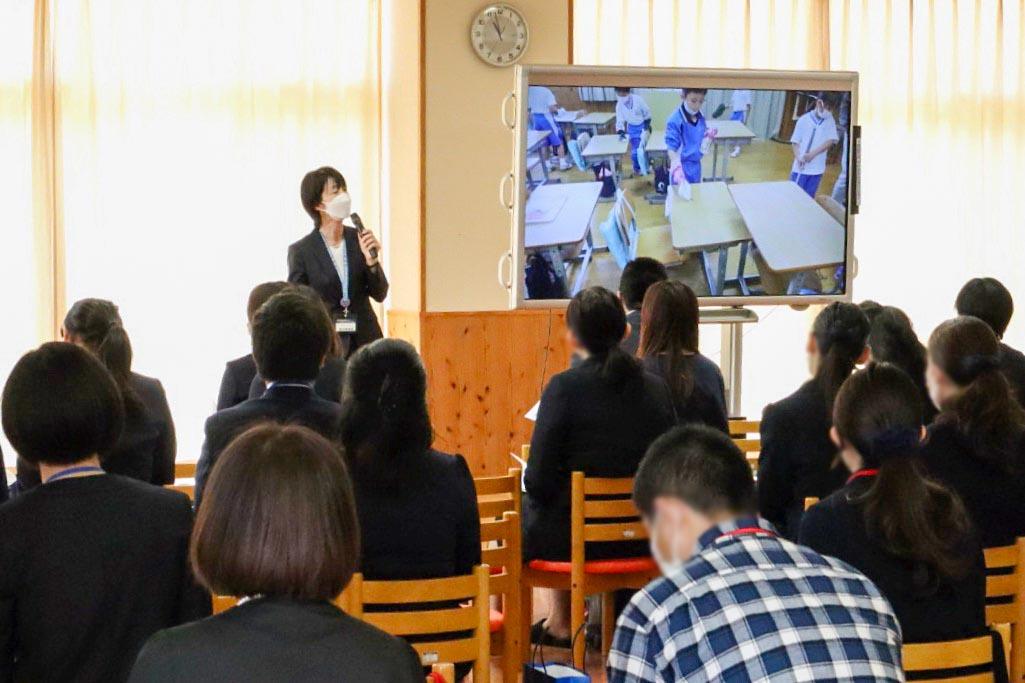 また、小学校での生活について、「ここ数年、コロナ禍の影響で児童たちも大変な時期を過ごしましたが、そのような状況だからこそ新しいチャレンジもでき、着実に成果も生まれています」と、スライドや動画を見ていただきながら話しました。特にリモートを活用して、学外の地域や海外の学校と結んでの取り組みついては、参加した保護者の皆様からも大きな関心を示していただいたようです。