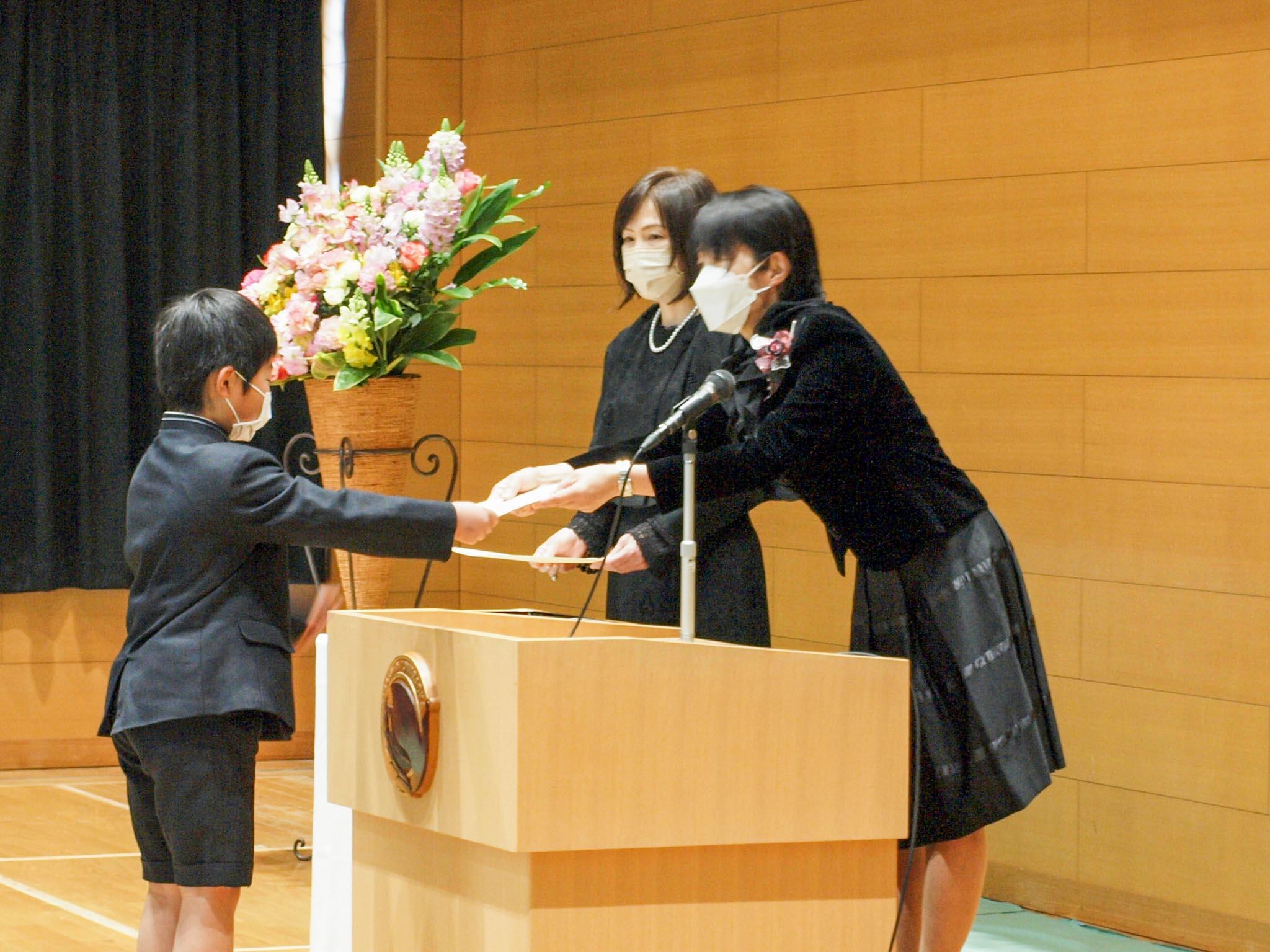 保護者の方々と教職員の拍手に迎えられ、P4生が入場しました。担任の先生から一人ひとりの名前が呼ばれ、梅田校長から修了証書が手渡されるとしっかりと受け取りました。