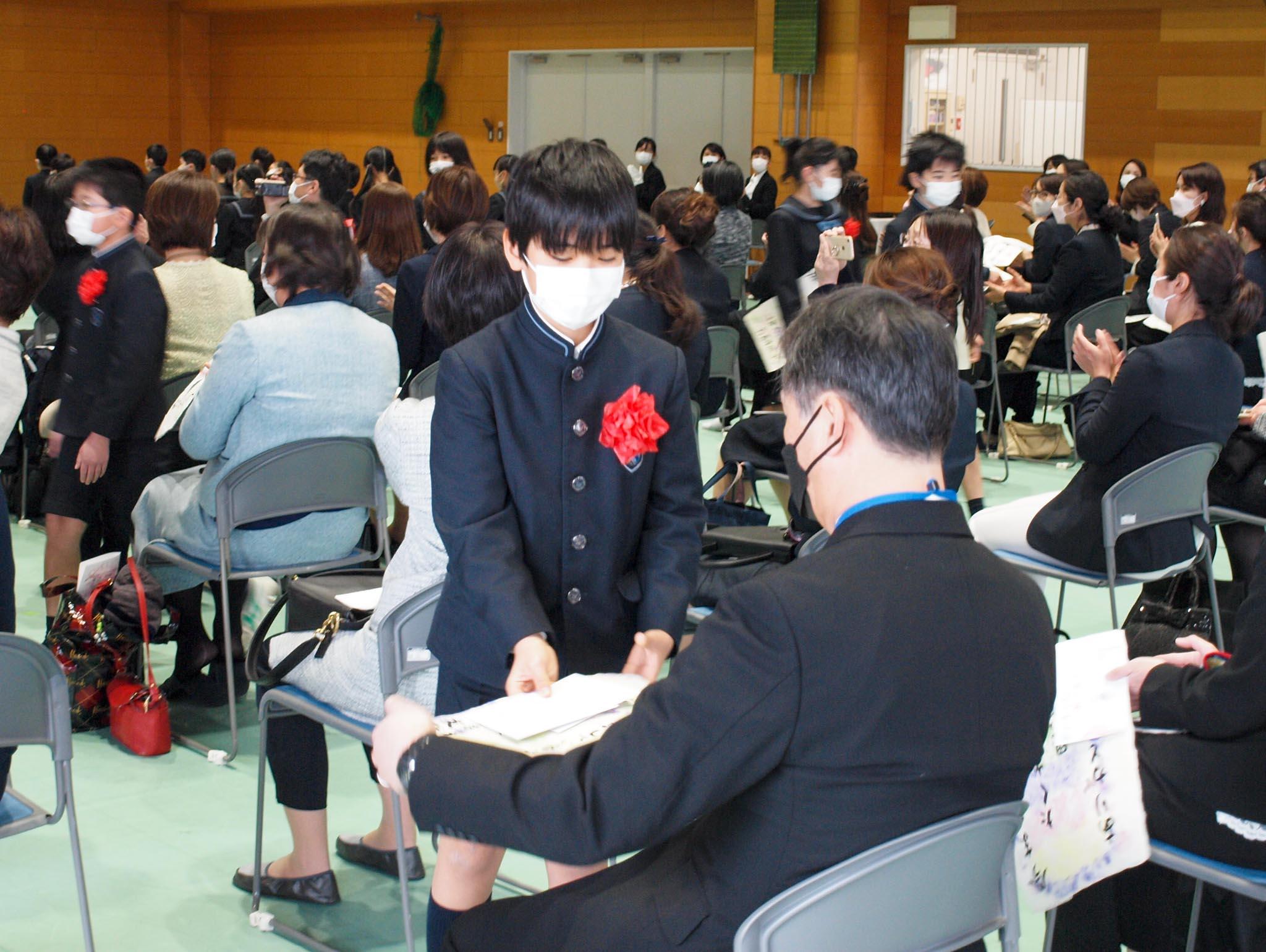 校長は式辞で、「今年度はコロナ禍の中で、世界の変化が巻き起こりました。今まで人間は、大きな変化があるときにイノベーションを起こし、そこから新たな価値や変革を生んできました。本校でも場所や時間を選ばずに多様な学び方ができるようになってきています。そのような新しい奈良学園の学びも、本校の校訓『尚志』が目指すところにつながるように思います。自分の志を強く持って粘り強く頑張れば、どんなことでもできるようになっていきます。Middle課程へ歩を進めてからも、今まで学んできたことを活かして成果を積み重ねていってください」と、お祝いの言葉を贈りました。