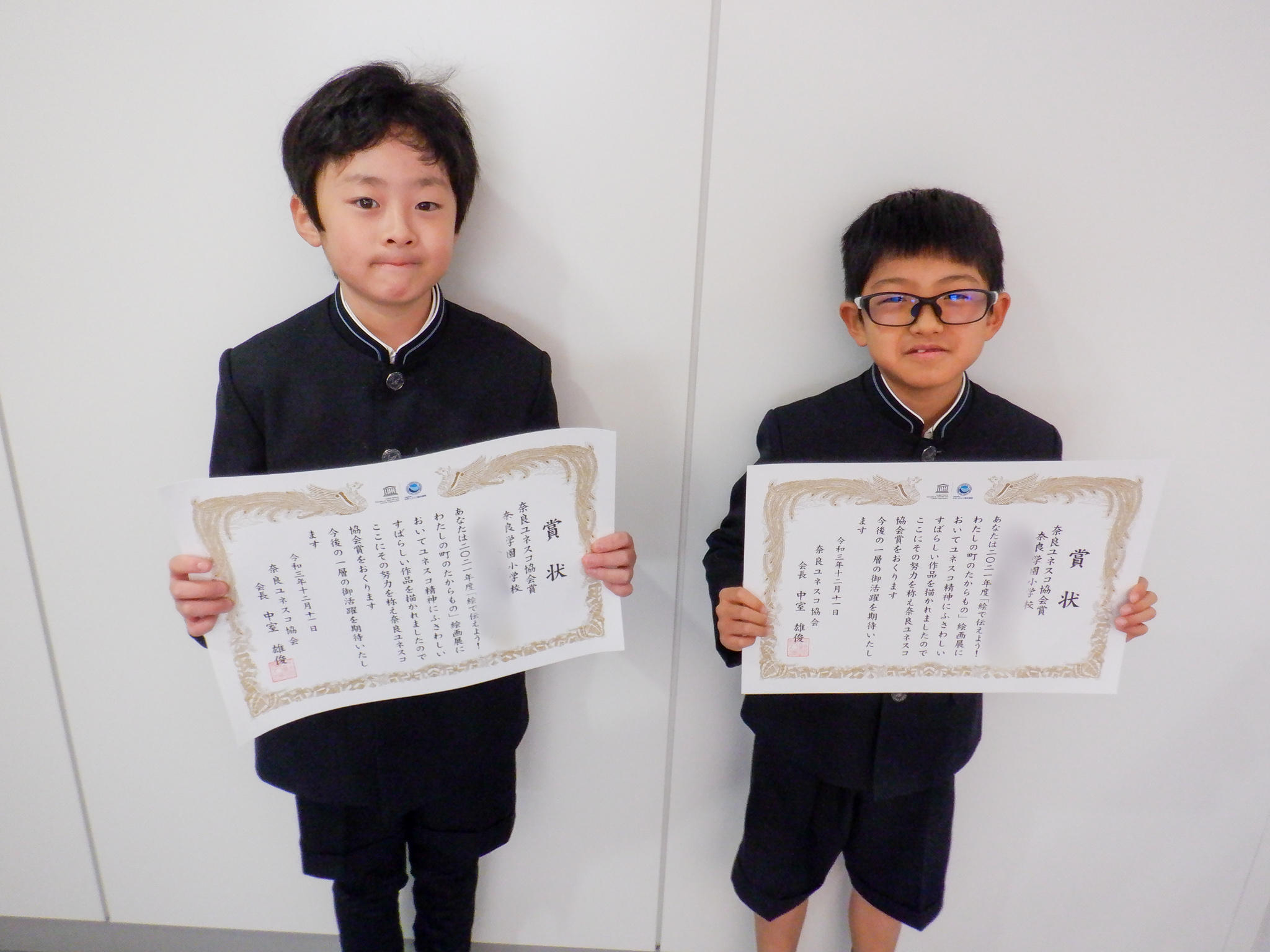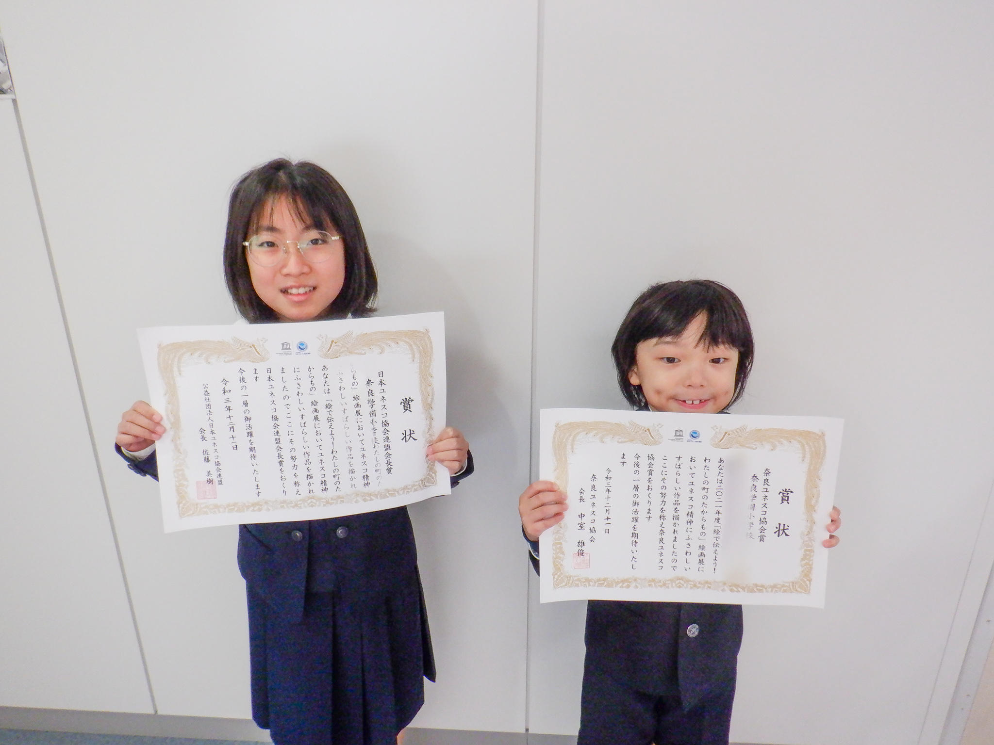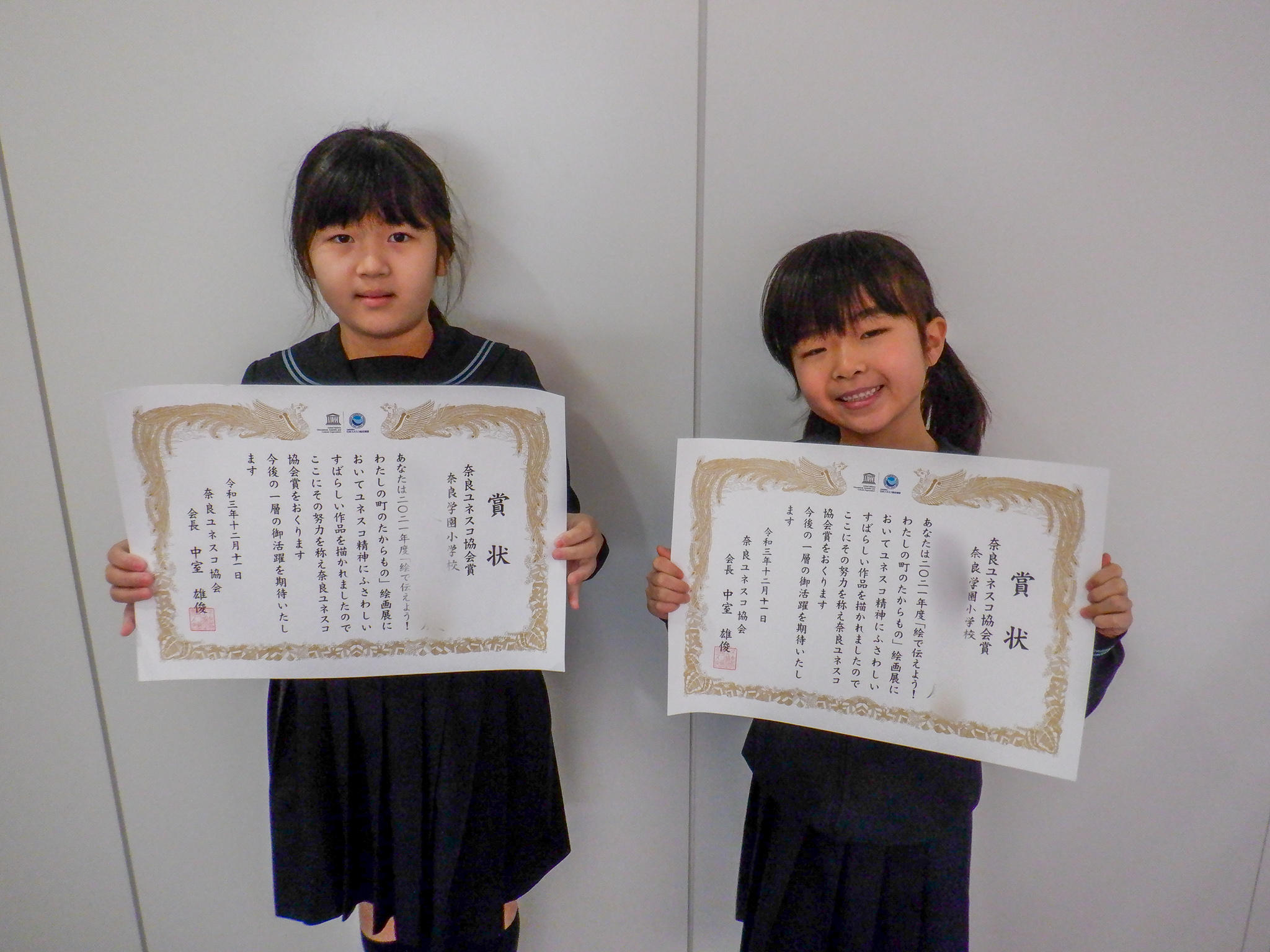 12月11日(金)に、「絵で伝えよう! わたしの町のたからもの」絵画展の表彰式が行われました。本校からは、日本ユネスコ協会連盟会長賞、奈良ユネスコ協会賞の受賞がありました。