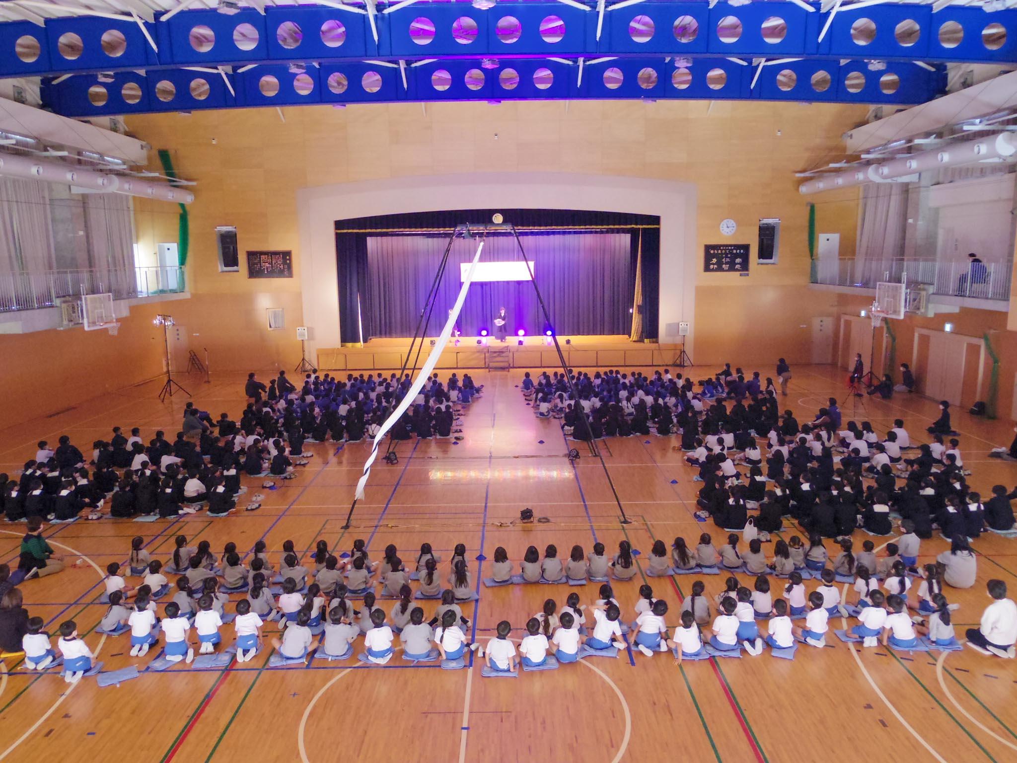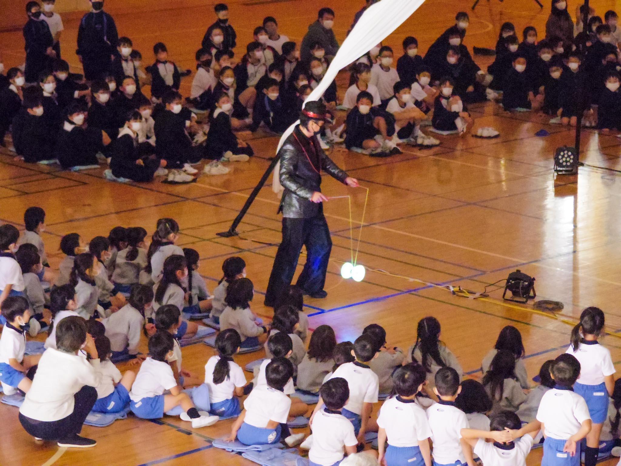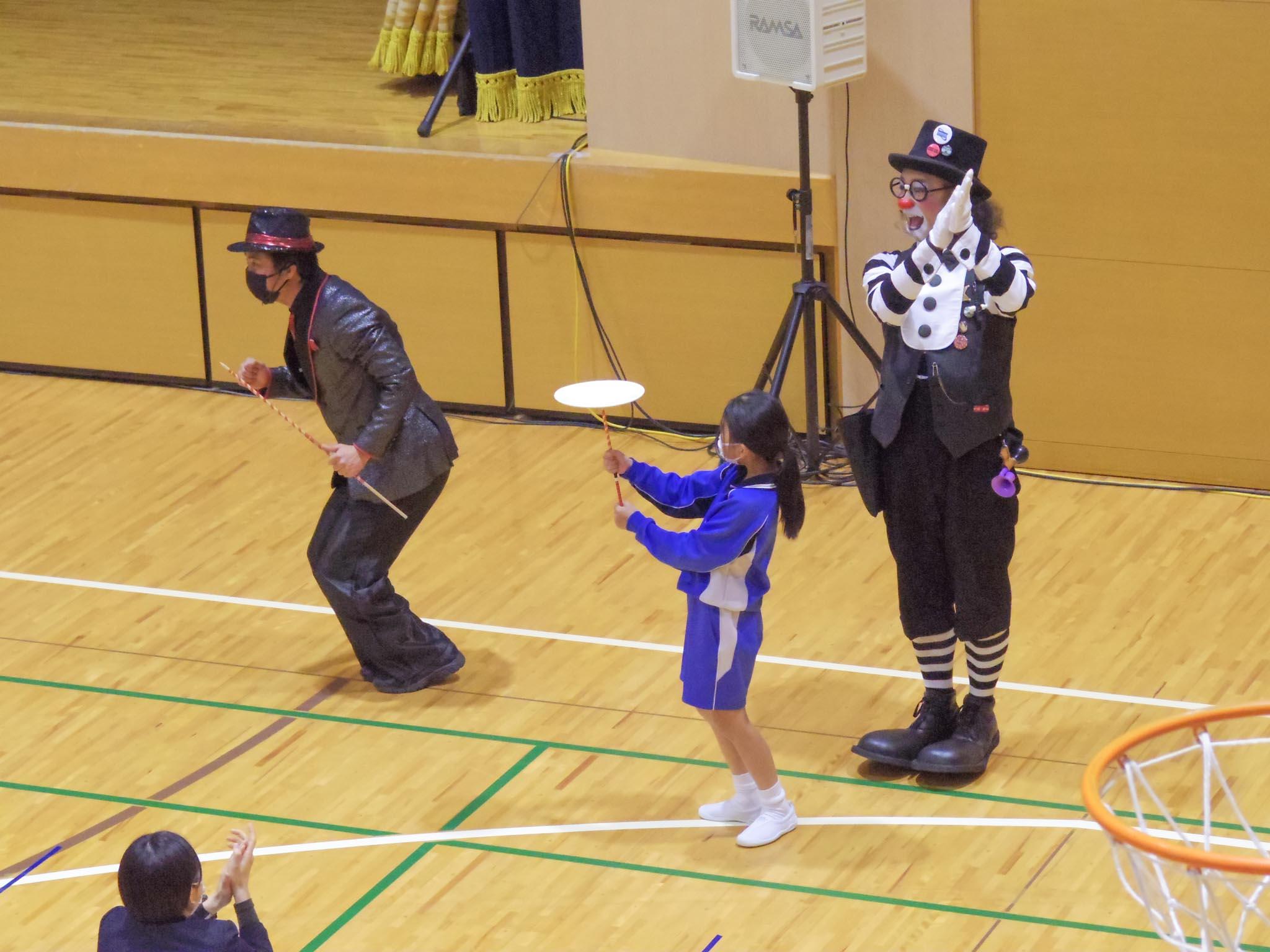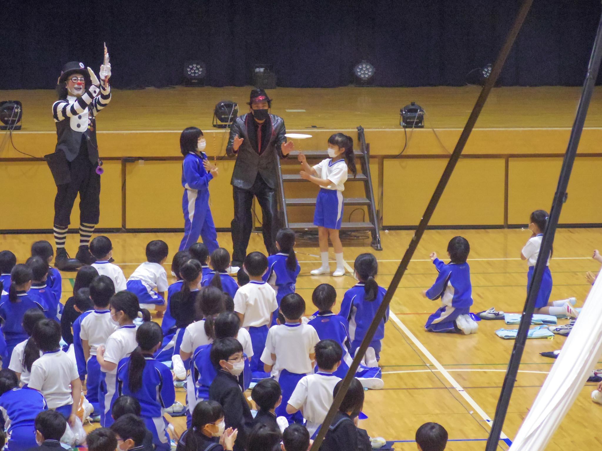 ピエロのパフォーマンスに始まって、多種多彩なジャグリングやイリュージョンが披露されると、児童たちは冒頭から歓声を上げていました。途中、教員が一輪車トリックを手伝う場面や、各学年一人ずつが皿回しの皿を受け渡していく皿回しリレーなどの演目もあり、会場全体が盛り上がりました。