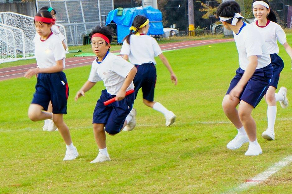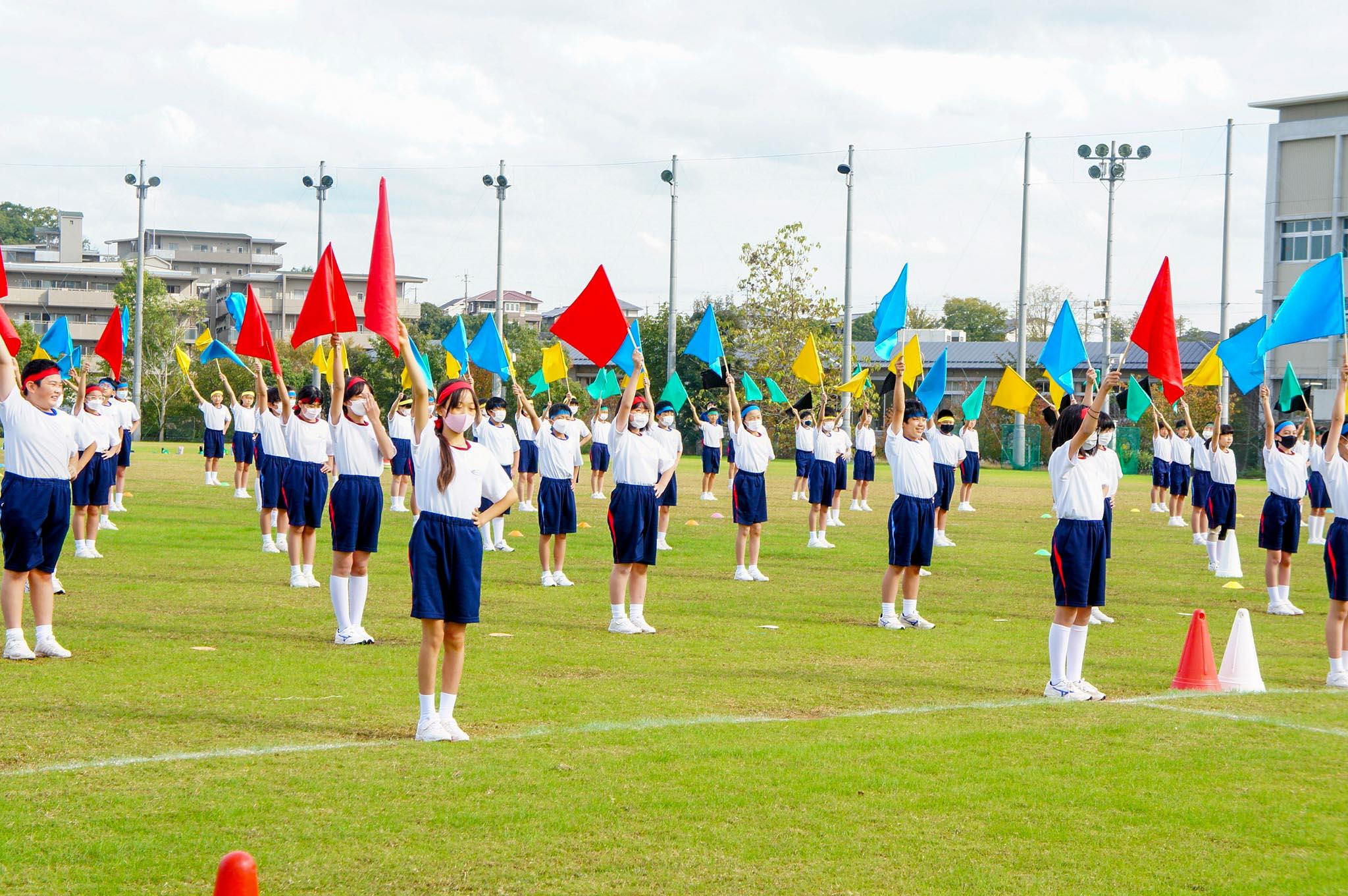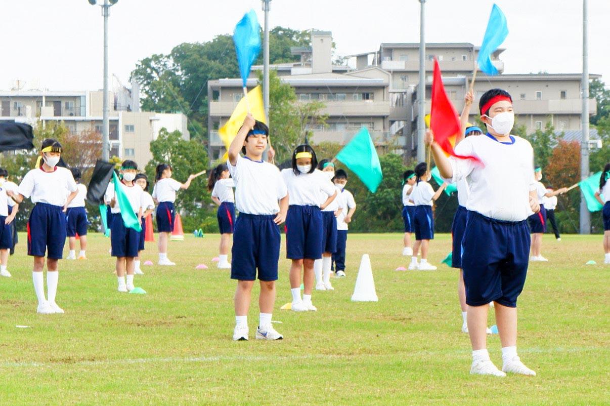 まずは、M1生とM2生合同で取り組む表現演技です。子どもたちは秋のやわらかな陽の光に緑が映える総合グラウンドいっぱいに、オリンピックをイメージした5色のフラッグを力強く振って、素晴らしいパフォーマンスを披露し、参観されている保護者の皆様からの大きな拍手をいただきました。