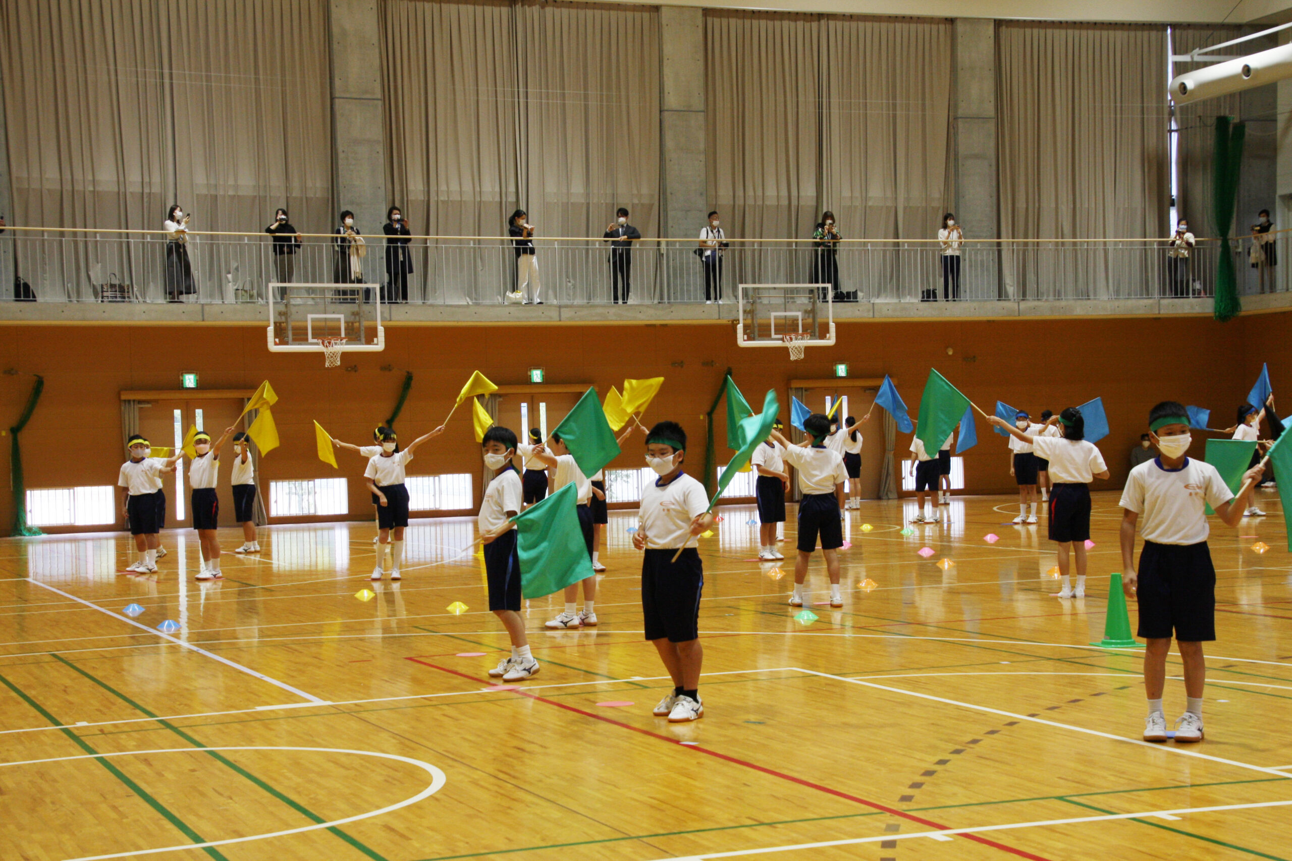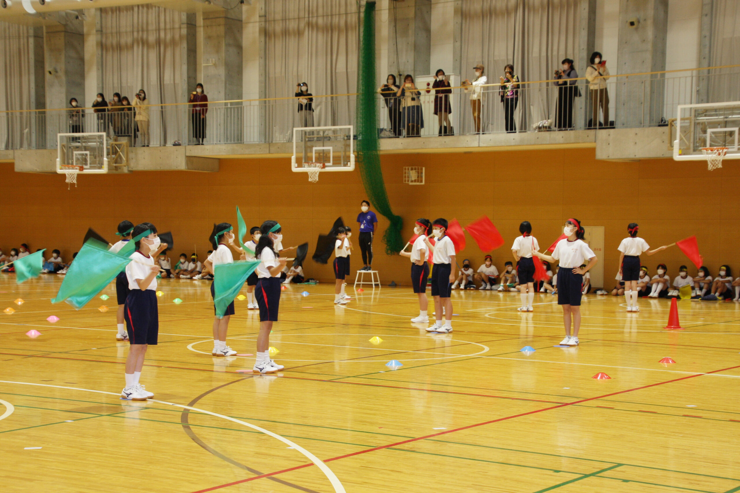 フラッグは難しい技もある中、先生に教えてもらうだけでなく、友だちとも教えあいながら動きをそろえることを意識しました。「バサッ」というフラッグの音が体育館に響き渡り、子どもたちの演技に向ける気合と緊張感が伝わってきました。