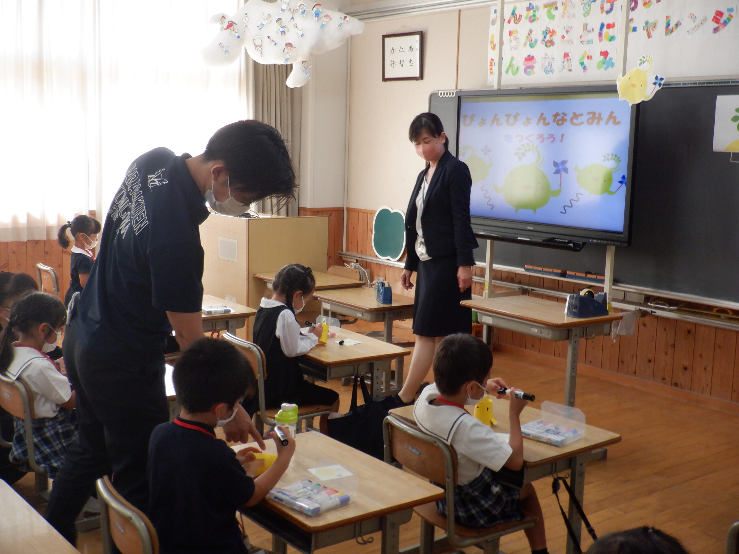 図工では、本校のマスコットキャラクターである「なとみん」をモチーフにした、紙コップロケットを制作しました。なとみんの黄色い体を表すために、P4生がひとつひとつ材料である紙コップを、事前に黄色く塗ってくれました。その紙コップに、顔やくちばしを思い思いに描き、オリジナルのなとみん紙コップロケットができあがりました。図工のお勉強の間、保護者の方には、入試報告会・学校説明会を行いました。