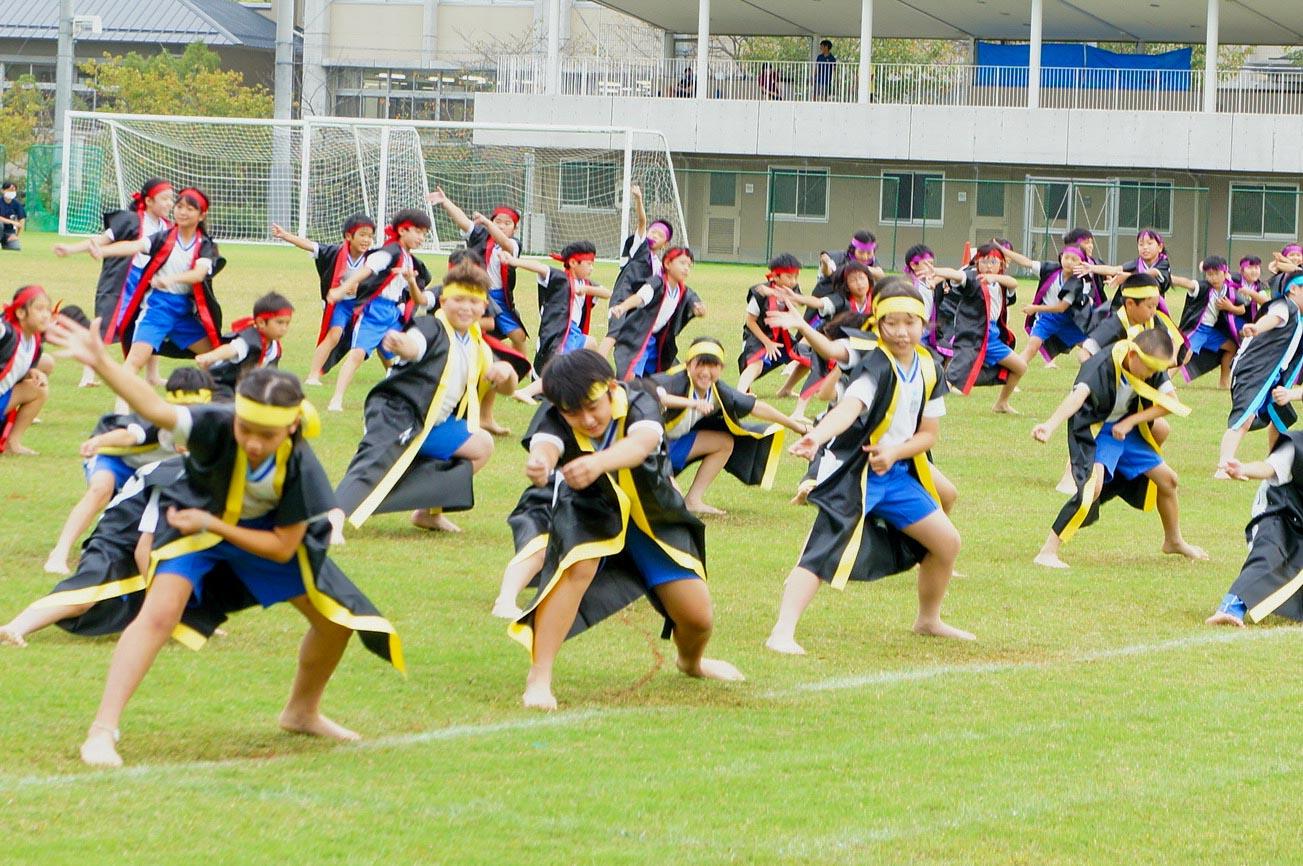 全員が、自分が一番好きな漢字一文字を描いた法被をはおり、総合グラウンドに整列しました。