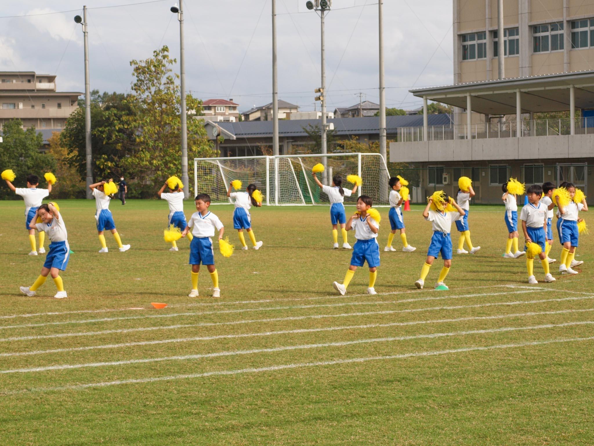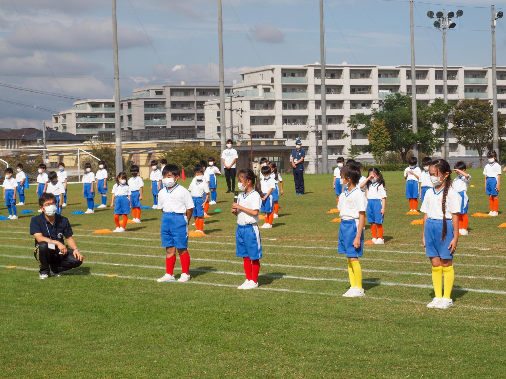 まず、先生から「昨日の雨も子どもたちの思いが通じたのか、今日はすっかり止み、晴れわたる中、グラウンドを使って体育参観ができることを嬉しく思います」と挨拶がありました。