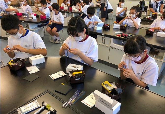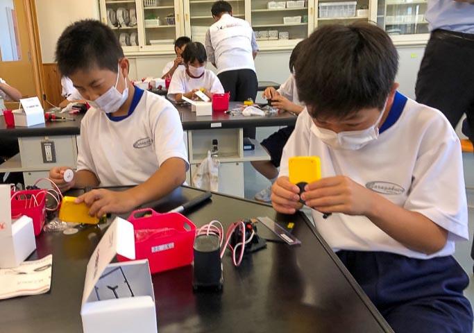 電気を生み出す仕組みについて教えていただいた後、一人に一つずつ用意していただいた手回し発電機のキットを使って、作成を開始。