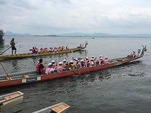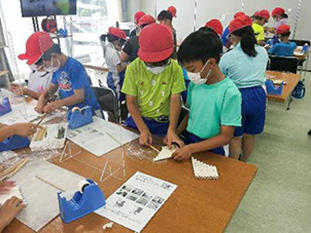その後はA組B組に分かれて、それぞれドラゴンボートとヨシ笛作りから活動をスタートさせました。ドラゴンボートでは、クラスを赤白2チームに分け、チームで協力してボートを進めていきました。はじめは上手に進まなかったボートも、声を掛け合いだんだんうまく進むようになりました。ヨシ笛は、琵琶湖の水質浄化にも関わるヨシを使用したヨシ紙で作るクラフトで、一つ一つ丁寧に仕上げていく子どもたちの姿が印象的でした。
