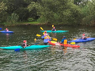 昼食のコロッケカレーをおいしくいただいた後は、カヌーの活動も行いました。一人一艘のカヌーに乗り込み、意気揚々と琵琶湖へとこぎ出していきました。しっかり乗りこなす子もいれば、うまく進めることができずあたふたする子もおり、スタッフの方に助けられながら、全員琵琶湖を楽しむことができました。