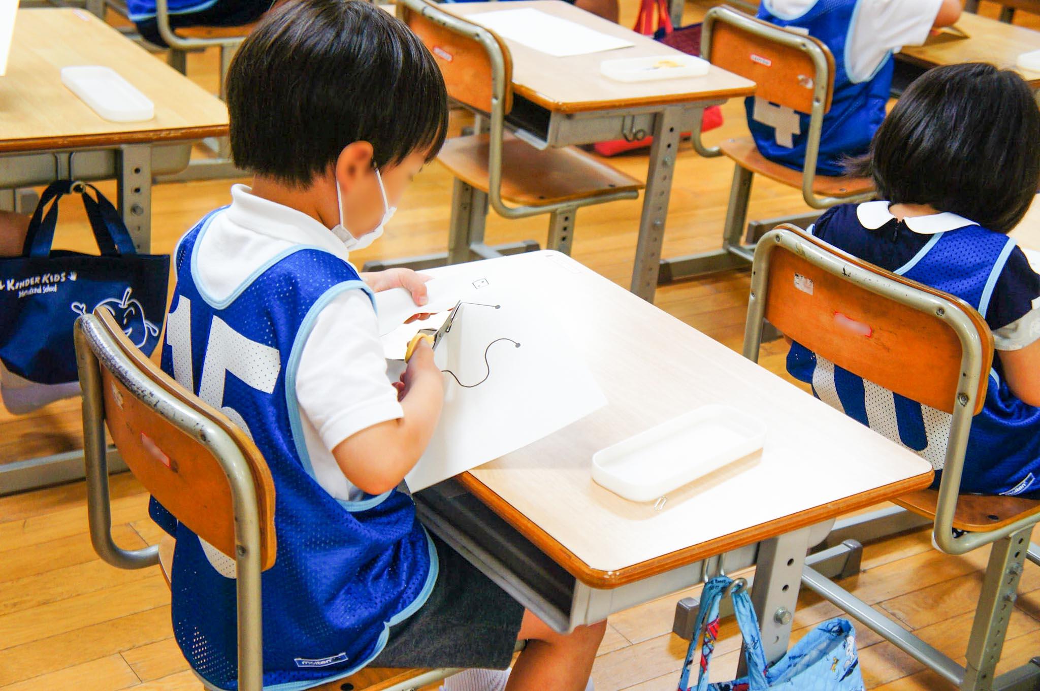はさみレッスンの時間では、はさみを使って直線や曲線、ジグザグ線、渦巻線に沿って切るレッスンをしました。「はさみを動かすのではなく、紙を動かして切ってね」の先生の言葉に、子どもたちはイラストが描かれた紙を回しながら上手に切り取っていきました。
